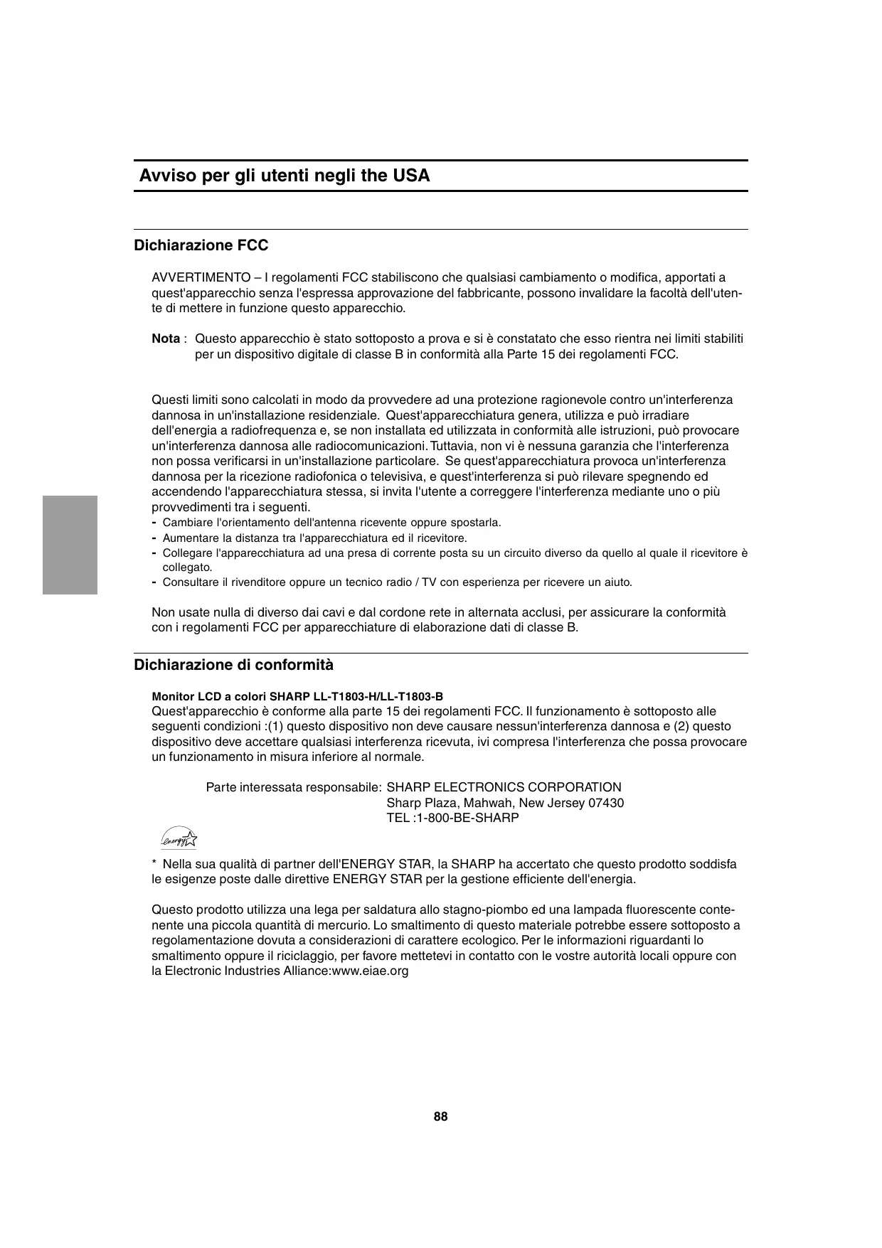 Monitor LCD a colori SHARP LL-T1803-H/LL-T1803-B Quest'apparecchio è conforme alla parte 15 dei regolamenti FCC. Il funzionamento è sottoposto alle seguenti condizioni :(1) questo dispositivo non deve causare nessun'interferenza dannosa e (2) questo dispositivo deve accettare qualsiasi interferenza ricevuta, ivi compresa l'interferenza che possa provocare un funzionamento in misura inferiore al normale. Parte interessata responsabile: SHARP ELECTRONICS CORPORATION Sharp Plaza, Mahwah, New Jersey 07430 TEL :1-800-BE-SHARP