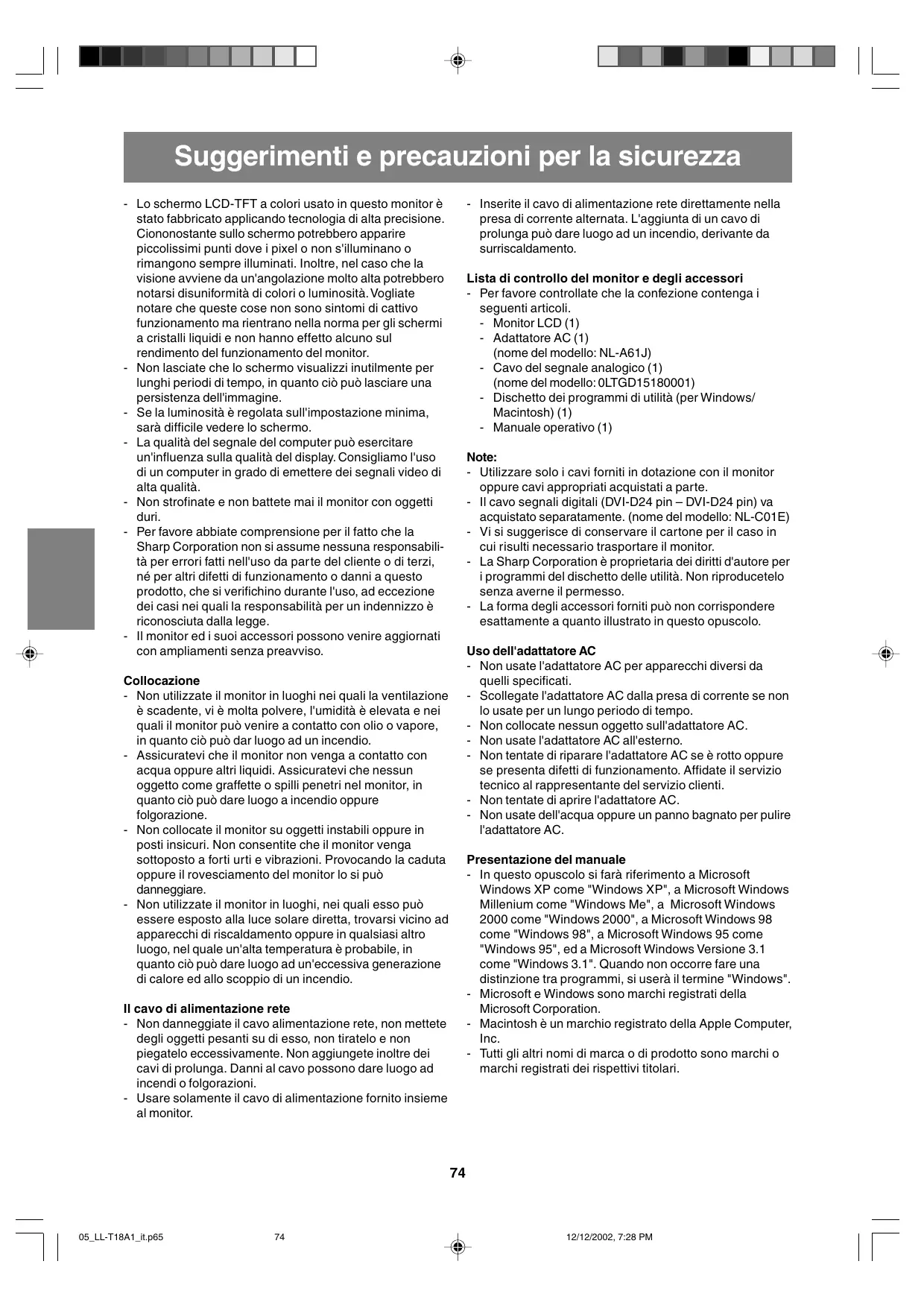 12/12/2002, 7:28 PM Suggerimenti e precauzioni per la sicurezza - Lo schermo LCD-TFT a colori usato in questo monitor è stato fabbricato applicando tecnologia di alta precisione. Ciononostante sullo schermo potrebbero apparire piccolissimi punti dove i pixel o non s'illuminano o rimangono sempre illuminati. Inoltre, nel caso che la visione avviene da un'angolazione molto alta potrebbero notarsi disuniformità di colori o luminosità. Vogliate notare che queste cose non sono sintomi di cattivo funzionamento ma rientrano nella norma per gli schermi a cristalli liquidi e non hanno effetto alcuno sul rendimento del funzionamento del monitor. - Non lasciate che lo schermo visualizzi inutilmente per lunghi periodi di tempo, in quanto ciò può lasciare una persistenza dell'immagine. - Se la luminosità è regolata sull'impostazione minima, sarà difficile vedere lo schermo. - La qualità del segnale del computer può esercitare un'influenza sulla qualità del display. Consigliamo l'uso di un computer in grado di emettere dei segnali video di alta qualità. - Non strofinate e non battete mai il monitor con oggetti duri. - Per favore abbiate comprensione per il fatto che la Sharp Corporation non si assume nessuna responsabilità per errori fatti nell'uso da parte del cliente o di terzi, né per altri difetti di funzionamento o danni a questo prodotto, che si verifichino durante l'uso, ad eccezione dei casi nei quali la responsabilità per un indennizzo è riconosciuta dalla legge. - Il monitor ed i suoi accessori possono venire aggiornati con ampliamenti senza preavviso.