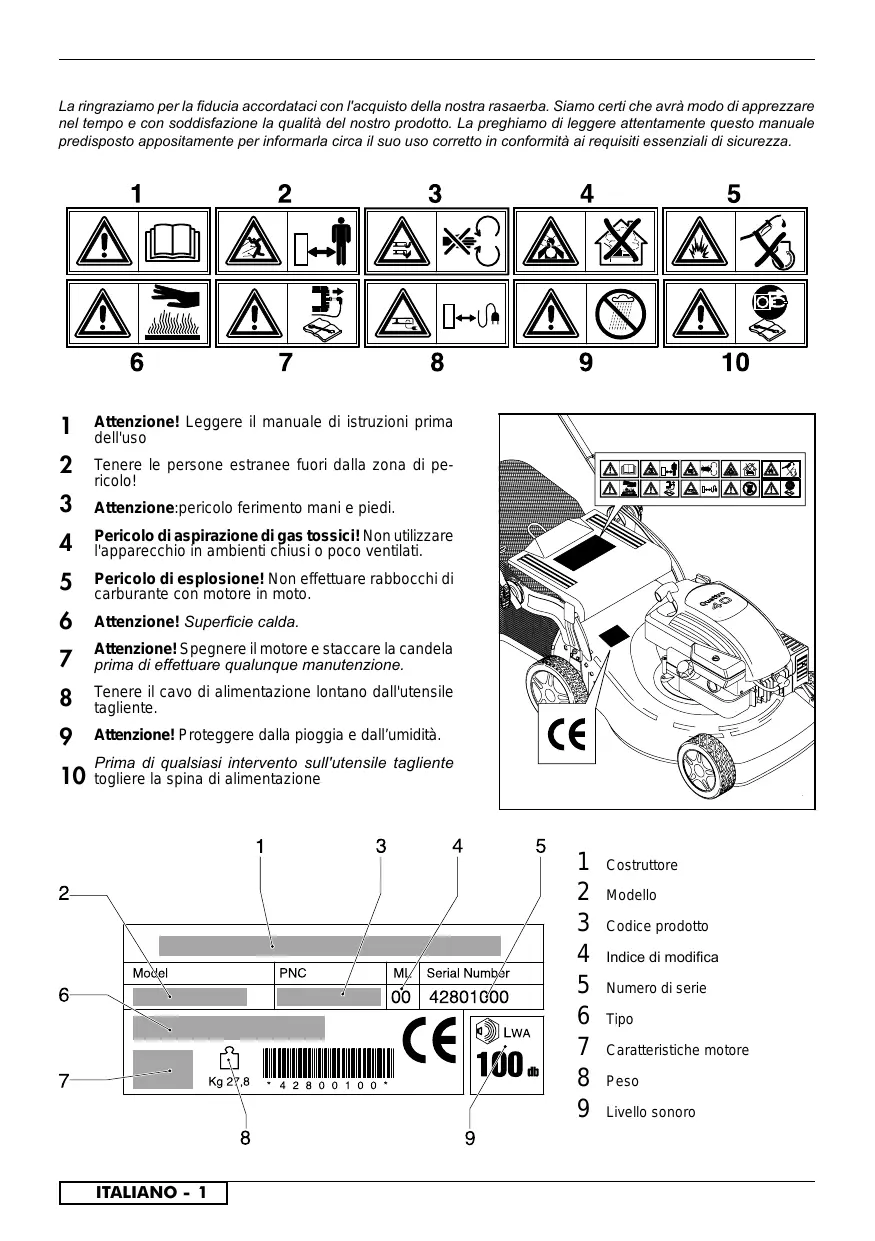 ITALIANO - 1 Costruttore Modello Codice prodotto Indice di modifica Numero di serie Tipo Caratteristiche motore Peso Livello sonoro