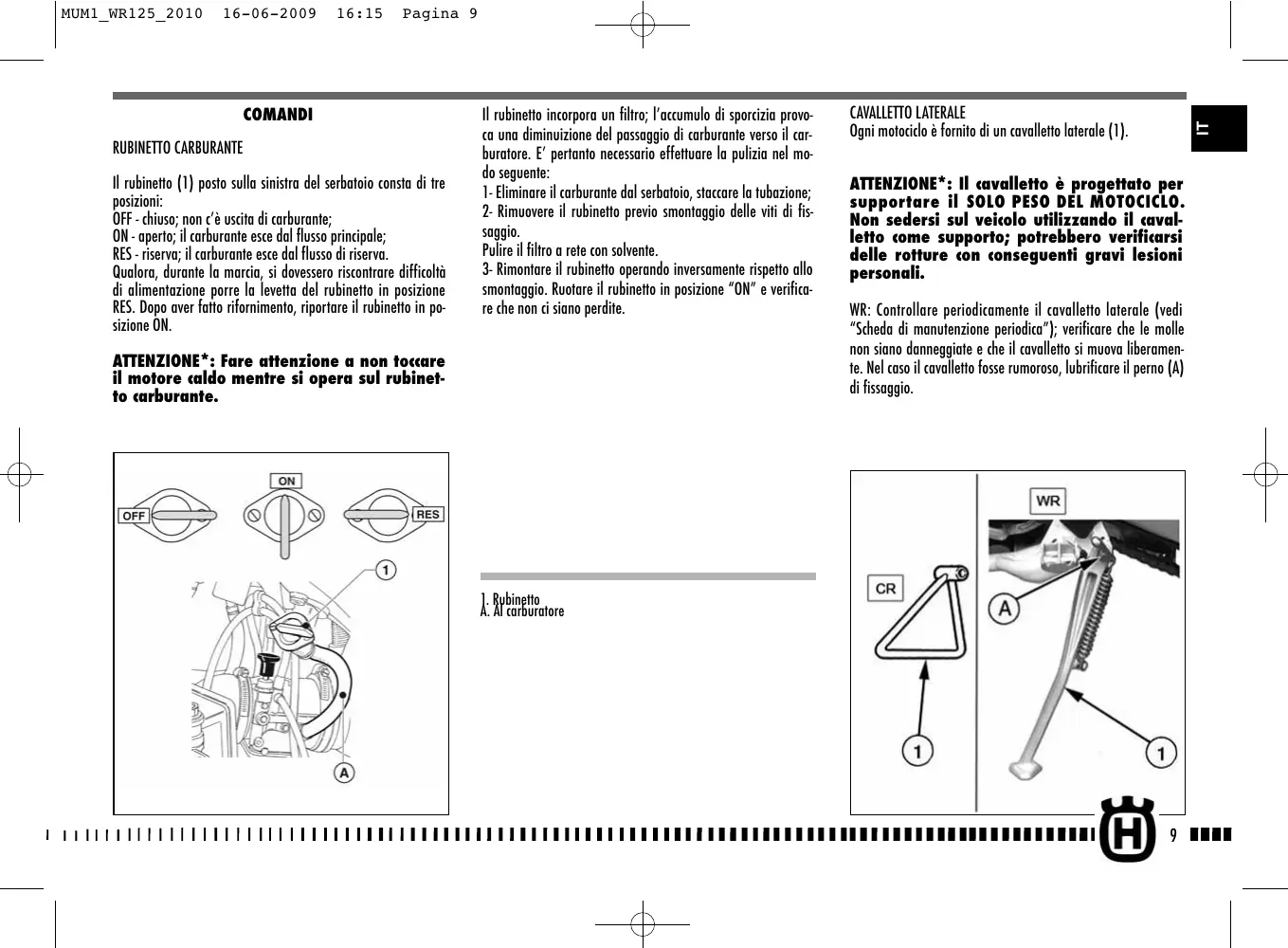 MUM1_WR125_2010 ATTENZIONE*: Il cavalletto è progettato per supportare il SOLO PESO DEL MOTOCICLO. Non sedersi sul veicolo utilizzando il cavalletto come supporto; potrebbero verificarsi delle rotture con conseguenti gravi lesioni personali. WR: Controllare periodicamente il cavalletto laterale (vedi “Scheda di manutenzione periodica”); verificare che le molle non siano danneggiate e che il cavalletto si muova liberamente. Nel caso il cavalletto fosse rumoroso, lubrificare il perno (A) di fissaggio.