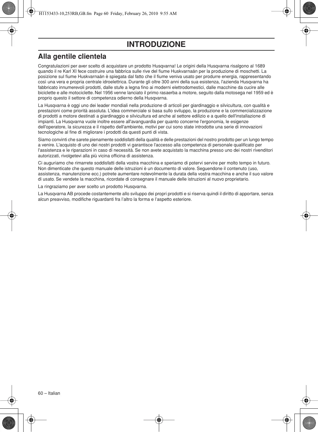 H1153433-10,253RB,GB.fm Page 60 Friday, February 26, 2010 9:55 AM INTRODUZIONE Alla gentile clientela Congratulazioni per aver scelto di acquistare un prodotto Husqvarna! Le origini della Husqvarna risalgono al 1689 quando il re Karl XI fece costruire una fabbrica sulle rive del fiume Huskvarnaån per la produzione di moschetti. La posizione sul fiume Huskvarnaån è spiegata dal fatto che il fiume veniva usato per produrre energia, rappresentando così una vera e propria centrale idroelettrica. Durante gli oltre 300 anni della sua esistenza, l'azienda Husqvarna ha fabbricato innumerevoli prodotti, dalle stufe a legna fino ai moderni elettrodomestici, dalle macchine da cucire alle biciclette e alle motociclette. Nel 1956 venne lanciato il primo rasaerba a motore, seguito dalla motosega nel 1959 ed è proprio questo il settore di competenza odierno della Husqvarna. La Husqvarna è oggi uno dei leader mondiali nella produzione di articoli per giardinaggio e silvicultura, con qualità e prestazioni come priorità assoluta. L'idea commerciale si basa sullo sviluppo, la produzione e la commercializzazione di prodotti a motore destinati a giardinaggio e silvicultura ed anche al settore edilizio e a quello dell'installazione di impianti. La Husqvarna vuole inoltre essere all'avanguardia per quanto concerne l'ergonomia, le esigenze dell'operatore, la sicurezza e il rispetto dell'ambiente, motivi per cui sono state introdotte una serie di innovazioni tecnologiche al fine di migliorare i prodotti da questi punti di vista. Siamo convinti che sarete pienamente soddisfatti della qualità e delle prestazioni del nostro prodotto per un lungo tempo a venire. L'acquisto di uno dei nostri prodotti vi garantisce l'accesso alla competenza di personale qualificato per l'assistenza e le riparazioni in caso di necessità. Se non avete acquistato la macchina presso uno dei nostri rivenditori autorizzati, rivolgetevi alla più vicina officina di assistenza. Ci auguriamo che rimarrete soddisfatti della vostra macchina e speriamo di potervi servire per molto tempo in futuro. Non dimenticate che questo manuale delle istruzioni è un documento di valore. Seguendone il contenuto (uso, assistenza, manutenzione ecc.) potrete aumentare notevolmente la durata della vostra macchina e anche il suo valore di usato. Se vendete la macchina, ricordate di consegnare il manuale delle istruzioni al nuovo proprietario. La ringraziamo per aver scelto un prodotto Husqvarna. La Husqvarna AB procede costantemente allo sviluppo dei propri prodotti e si riserva quindi il diritto di apportare, senza alcun preavviso, modifiche riguardanti fra l’altro la forma e l’aspetto esteriore.