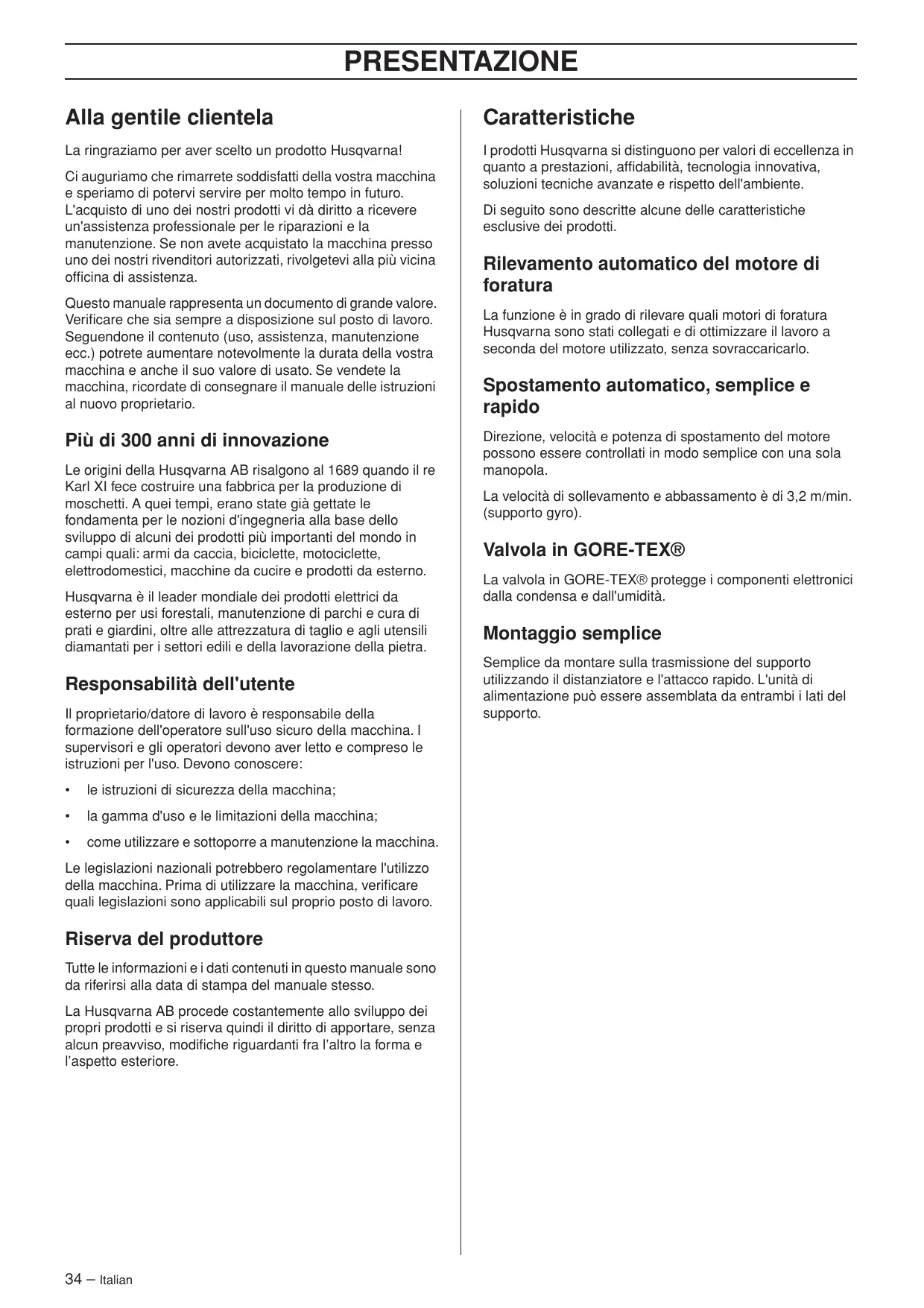 Italian – 33 PRESENTAZIONE Alla gentile clientela Caratteristiche La ringraziamo per aver scelto un prodotto Husqvarna! I prodotti Husqvarna si distinguono per valori di eccellenza in quanto a prestazioni, affidabilità, tecnologia innovativa, soluzioni tecniche avanzate e rispetto dell'ambiente. Ci auguriamo che rimarrete soddisfatti della vostra macchina e speriamo di potervi servire per molto tempo in futuro. L'acquisto di uno dei nostri prodotti vi dà diritto a ricevere un'assistenza professionale per le riparazioni e la manutenzione. Se non avete acquistato la macchina presso uno dei nostri rivenditori autorizzati, rivolgetevi alla più vicina officina di assistenza. Questo manuale rappresenta un documento di grande valore. Verificare che sia sempre a disposizione sul posto di lavoro. Seguendone il contenuto (uso, assistenza, manutenzione ecc.) potrete aumentare notevolmente la durata della vostra macchina e anche il suo valore di usato. Se vendete la macchina, ricordate di consegnare il manuale delle istruzioni al nuovo proprietario. Più di 300 anni di innovazione Le origini della Husqvarna AB risalgono al 1689 quando il re Karl XI fece costruire una fabbrica per la produzione di moschetti. A quei tempi, erano state già gettate le fondamenta per le nozioni d'ingegneria alla base dello sviluppo di alcuni dei prodotti più importanti del mondo in campi quali: armi da caccia, biciclette, motociclette, elettrodomestici, macchine da cucire e prodotti da esterno. Husqvarna è il leader mondiale dei prodotti elettrici da esterno per usi forestali, manutenzione di parchi e cura di prati e giardini, oltre alle attrezzatura di taglio e agli utensili diamantati per i settori edili e della lavorazione della pietra. Responsabilità dell'utente Il proprietario/datore di lavoro è responsabile della formazione dell'operatore sull'uso sicuro della macchina. I supervisori e gli operatori devono aver letto e compreso le istruzioni per l'uso. Devono conoscere: