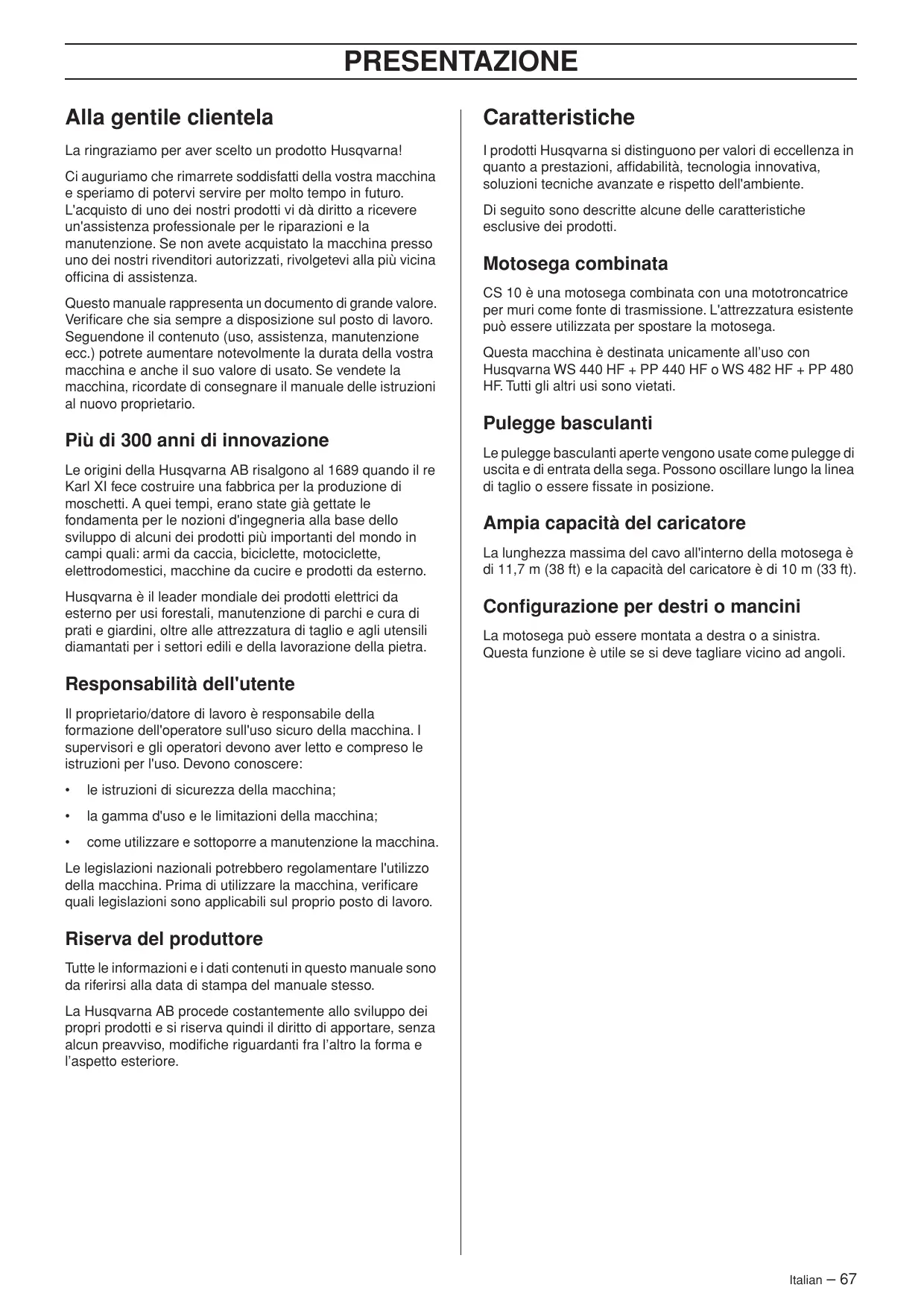 PRESENTAZIONE Alla gentile clientela Caratteristiche La ringraziamo per aver scelto un prodotto Husqvarna! I prodotti Husqvarna si distinguono per valori di eccellenza in quanto a prestazioni, affidabilità, tecnologia innovativa, soluzioni tecniche avanzate e rispetto dell'ambiente. Ci auguriamo che rimarrete soddisfatti della vostra macchina e speriamo di potervi servire per molto tempo in futuro. L'acquisto di uno dei nostri prodotti vi dà diritto a ricevere un'assistenza professionale per le riparazioni e la manutenzione. Se non avete acquistato la macchina presso uno dei nostri rivenditori autorizzati, rivolgetevi alla più vicina officina di assistenza. Questo manuale rappresenta un documento di grande valore. Verificare che sia sempre a disposizione sul posto di lavoro. Seguendone il contenuto (uso, assistenza, manutenzione ecc.) potrete aumentare notevolmente la durata della vostra macchina e anche il suo valore di usato. Se vendete la macchina, ricordate di consegnare il manuale delle istruzioni al nuovo proprietario. Di seguito sono descritte alcune delle caratteristiche esclusive dei prodotti. Motosega combinata CS 10 è una motosega combinata con una mototroncatrice per muri come fonte di trasmissione. L'attrezzatura esistente può essere utilizzata per spostare la motosega. Questa macchina è destinata unicamente all’uso con Husqvarna WS 440 HF + PP 440 HF o WS 482 HF + PP 480 HF. Tutti gli altri usi sono vietati. Pulegge basculanti Più di 300 anni di innovazione Le origini della Husqvarna AB risalgono al 1689 quando il re Karl XI fece costruire una fabbrica per la produzione di moschetti. A quei tempi, erano state già gettate le fondamenta per le nozioni d'ingegneria alla base dello sviluppo di alcuni dei prodotti più importanti del mondo in campi quali: armi da caccia, biciclette, motociclette, elettrodomestici, macchine da cucire e prodotti da esterno. Husqvarna è il leader mondiale dei prodotti elettrici da esterno per usi forestali, manutenzione di parchi e cura di prati e giardini, oltre alle attrezzatura di taglio e agli utensili diamantati per i settori edili e della lavorazione della pietra. Le pulegge basculanti aperte vengono usate come pulegge di uscita e di entrata della sega. Possono oscillare lungo la linea di taglio o essere fissate in posizione. Ampia capacità del caricatore La lunghezza massima del cavo all'interno della motosega è di 11,7 m (38 ft) e la capacità del caricatore è di 10 m (33 ft). Configurazione per destri o mancini La motosega può essere montata a destra o a sinistra. Questa funzione è utile se si deve tagliare vicino ad angoli. Responsabilità dell'utente Il proprietario/datore di lavoro è responsabile della formazione dell'operatore sull'uso sicuro della macchina. I supervisori e gli operatori devono aver letto e compreso le istruzioni per l'uso. Devono conoscere: