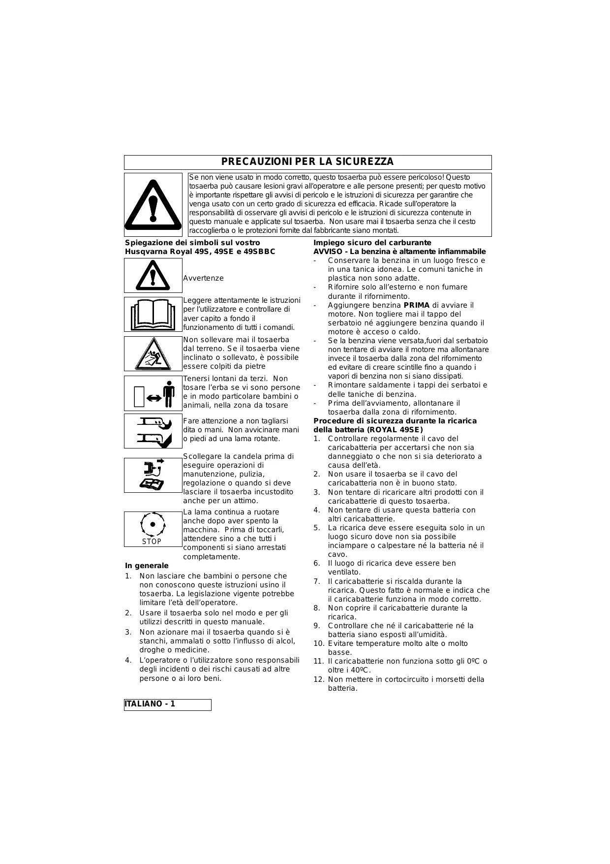 Se non viene usato in modo corretto, questo tosaerba può essere pericoloso! Questo tosaerba può causare lesioni gravi all’operatore e alle persone presenti; per questo motivo è importante rispettare gli avvisi di pericolo e le istruzioni di sicurezza per garantire che venga usato con un certo grado di sicurezza ed efficacia. Ricade sull’operatore la responsabilità di osservare gli avvisi di pericolo e le istruzioni di sicurezza contenute in questo manuale e applicate sul tosaerba. Non usare mai il tosaerba senza che il cesto raccoglierba o le protezioni fornite dal fabbricante siano montati. Spiegazione dei simboli sul vostro Husqvarna Royal 49S, 49SE e 49SBBC Avvertenze Leggere attentamente le istruzioni per l’utilizzatore e controllare di aver capito a fondo il funzionamento di tutti i comandi. Non sollevare mai il tosaerba dal terreno. Se il tosaerba viene inclinato o sollevato, è possibile essere colpiti da pietre Tenersi lontani da terzi. Non tosare l’erba se vi sono persone e in modo particolare bambini o animali, nella zona da tosare Fare attenzione a non tagliarsi dita o mani. Non avvicinare mani o piedi ad una lama rotante. Scollegare la candela prima di eseguire operazioni di manutenzione, pulizia, regolazione o quando si deve lasciare il tosaerba incustodito anche per un attimo. STOP La lama continua a ruotare anche dopo aver spento la macchina. Prima di toccarli, attendere sino a che tutti i componenti si siano arrestati completamente. In generale