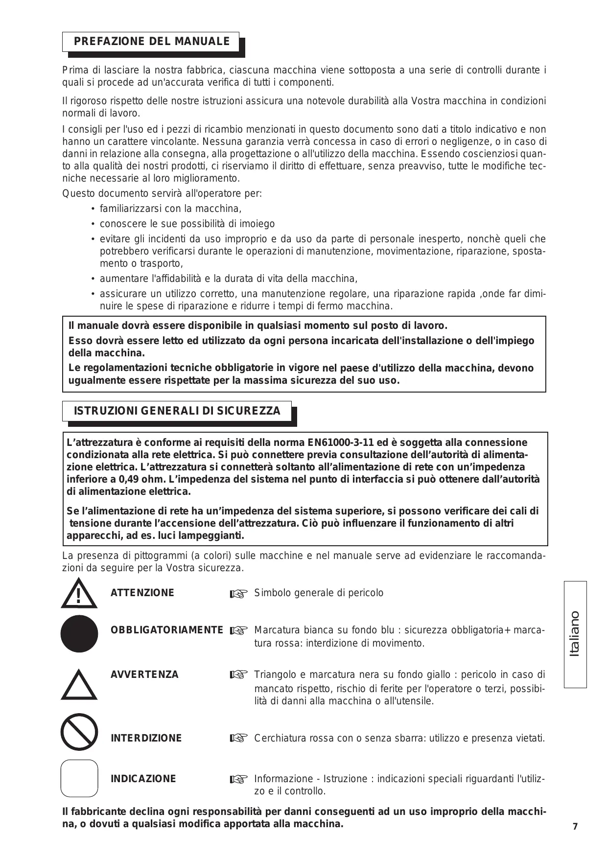 • garantizar una utilización correcta, un mantenimiento regular y un arreglo rápido para reducir los gastos de reparación y los tiempos de inmovilización. El manual debe estar disponible en cualquier momento en el lugar de trabajo. Deberá ser leído y utilizado por cualquier persona que se encargue de la instalación o del funcionamiento. Para mayor seguridad, también deben respetarse las normativas técnicas obligatorias vigentes en el país de utilización de la máquina.