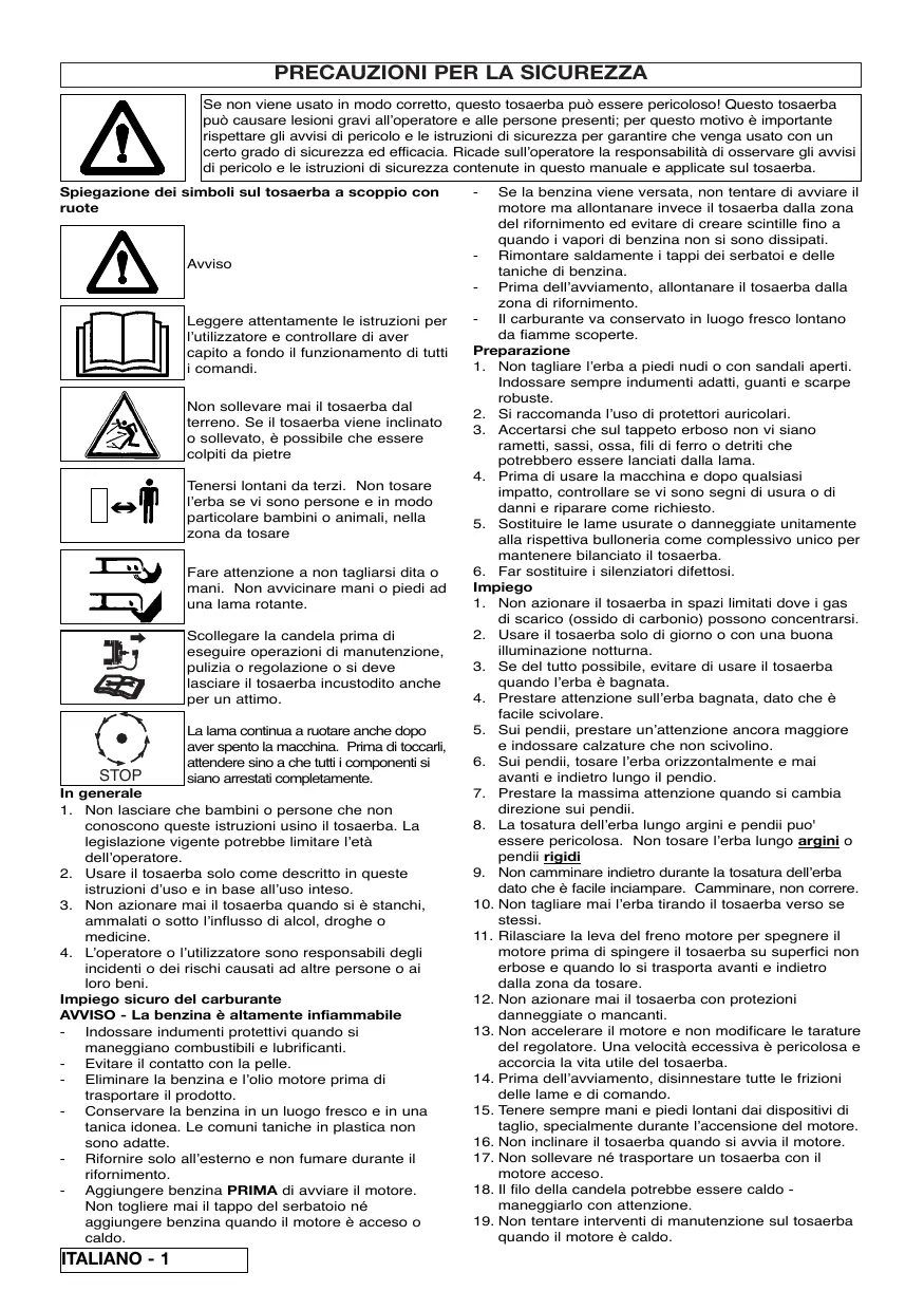 Leggere attentamente le istruzioni per l’utilizzatore e controllare di aver capito a fondo il funzionamento di tutti i comandi. Non sollevare mai il tosaerba dal terreno. Se il tosaerba viene inclinato o sollevato, è possibile che essere colpiti da pietre Tenersi lontani da terzi. Non tosare l’erba se vi sono persone e in modo particolare bambini o animali, nella zona da tosare Fare attenzione a non tagliarsi dita o mani. Non avvicinare mani o piedi ad una lama rotante. Scollegare la candela prima di eseguire operazioni di manutenzione, pulizia o regolazione o si deve lasciare il tosaerba incustodito anche per un attimo.