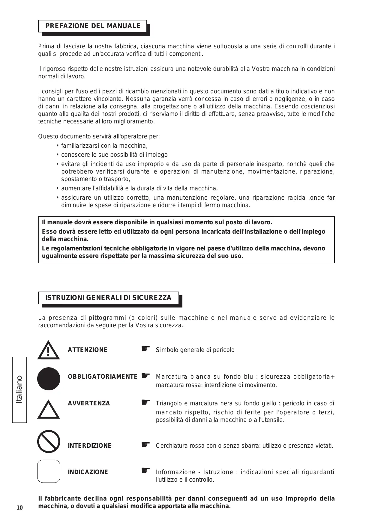La presenza di pittogrammi (a colori) sulle macchine e nel manuale serve ad evidenziare le raccomandazioni da seguire per la Vostra sicurezza. ATTENZIONE Æ Simbolo generale di pericolo OBBLIGATORIAMENTE BF Marcatura bianca su fondo blu : sicurezza obbligatoria+ marcatura rossa: interdizione di movimento. AVVERTENZA Æ Trangolo e marcatura nera su fondo giallo : pericolo in caso di mancato rispetto, rischio di ferite per l'operatore o terzi, possibilità di danni alla macchina o all'utensile. INTERDIZIONE Æ Cerchiatura rossa con o senza sbarra: utilizzo e presenza vietati. INDICAZIONE F informazione - Istruzione : indicazioni speciali riguardanti l'utilizzo e il controllo. PICLA Il fabbricante declina ogni responsabilità per danni conseguenti ad un uso improprio della macchina, o dovuti a qualsiasi modifica apportata alla macchina.