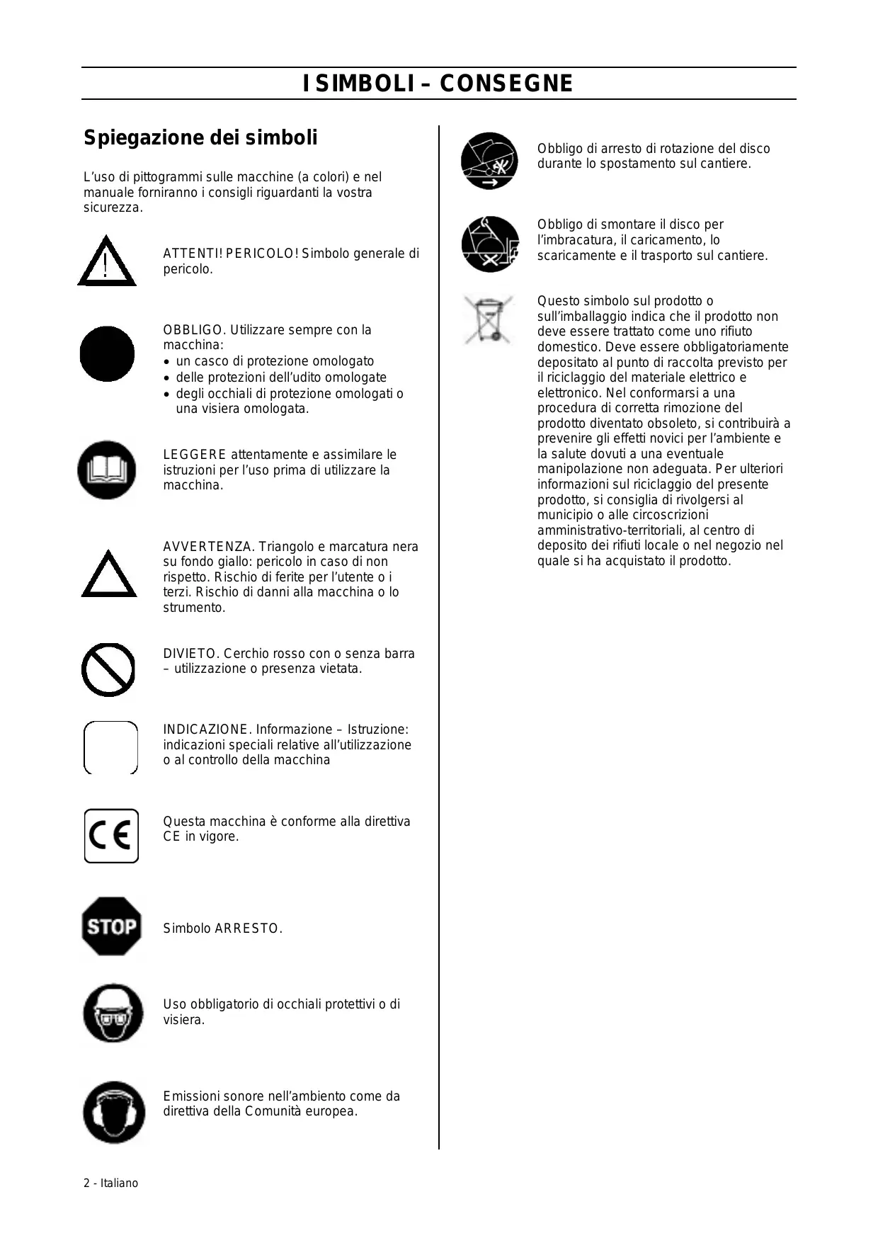 - degli occhiali di protezione omologati o una visiera omologata. LEGGERE attentamente e assimilare le istruzioni per l’uso prima di utilizzare la macchina. AVVERTENZA. Triangolo e marcatura nera su fondo giallo: pericolo in caso di non rispetto. Rischio di ferite per l’utente o i terzi. Rischio di danni alla macchina o lo strumento. DIVIETO. Cerchio rosso con o senza barra – utilizzazione o presenza vietata. INDICAZIONE. Informazione – Istruzione: indicazioni speciali relative all’utilizzazione o al controllo della macchina Questa macchina è conforme alla direttiva CE in vigore. Simbolo ARRESTO. Uso obbligatorio di occhiali protettivi o di visiera. Emissioni sonore nell’ambiento come da direttiva della Comunità europea.