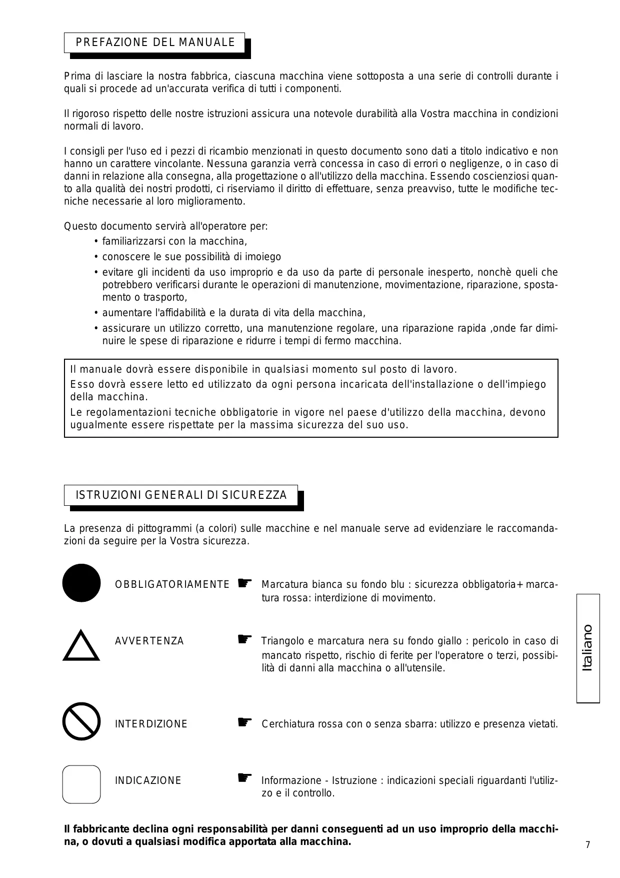 L'emploi de pictogrammes sur les machines (en couleur) et dans le manuel indiqueront des conseils qui concernent votre sécurité.
