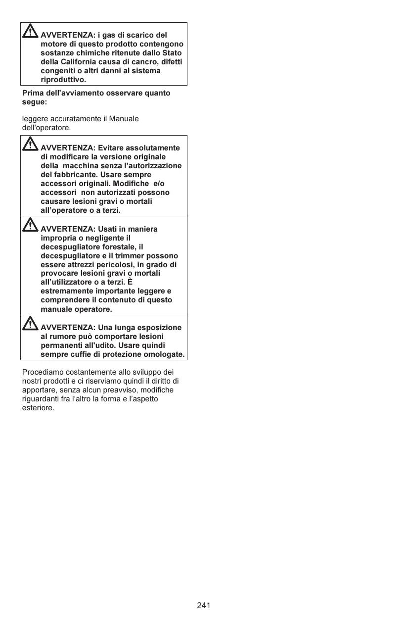 Contrôler les points suivants avant la mise en marche : Lisez attentivement le manuel d’utilisation. AVERTISSEMENT : Ne jamais modifier sous aucun prétexte la machine sans l’autorisation du fabricant. N’utiliser que des accessoires et des pièces d’origine. Des modifications nonautorisées et l’emploi d’accessoires non-homologués peuvent provoquer des accidents graves et même mortels, à l’utilisateur ou d’autres personnes. AVERTISSEMENT : Utilisés de manière négligente ou erronée, les scies d'éclaircissement et les coupe-herbes peuvent devenir des outils dangereux pouvant occasionner des blessures très graves, voire mortelles à l’utilisateur ou à d’autres personnes présentes. Il est très important de lire attentivement et de bien assimiler le contenu de ce manuel de l'opérateur. AVERTISSEMENT : Une exposition prolongée au bruit risque de causer des lésions auditives permanentes. Toujours utiliser des protecteurs d'oreilles agréés. Nous travaillons continuellement au développement de ses produits et nous réservons le droit d’en modifier, entre autres, la conception et l’aspect sans préavis.