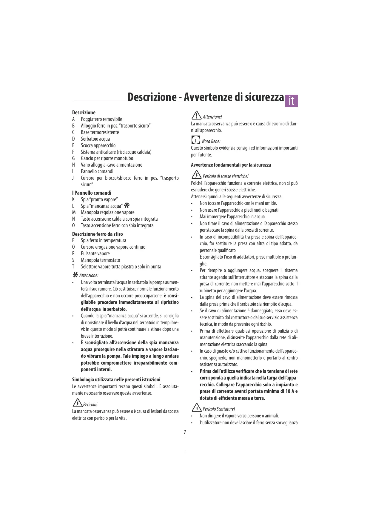 Descrizione - Avvertenze di sicurezza it Descrizione A Poggiaferro removibile B Alloggio ferro in pos. “trasporto sicuro” C Base termoresistente D Serbatoio acqua E Scocca apparecchio F Sistema anticalcare (risciacquo caldaia) G Gancio per riporre monotubo H Vano alloggia-cavo alimentazione I Pannello comandi J Cursore per blocco/sblocco ferro in pos. “trasporto sicuro” I Pannello comandi K Spia “pronto vapore” L Spia “mancanza acqua” M Manopola regolazione vapore N Tasto accensione caldaia con spia integrata O Tasto accensione ferro con spia integrata Descrizione ferro da stiro P Spia ferro in temperatura Q Cursore erogazione vapore continuo R Pulsante vapore S Manopola termostato T Selettore vapore tutta piastra o solo in punta Attenzione! La mancata osservanza può essere o è causa di lesioni o di danni all’apparecchio. Nota Bene: Questo simbolo evidenzia consigli ed informazioni importanti per l’utente. Avvertenze fondamentali per la sicurezza Pericolo di scosse elettriche! Poiché l’apparecchio funziona a corrente elettrica, non si può escludere che generi scosse elettriche. Attenersi quindi alle seguenti avvertenze di sicurezza: t /POUPDDBSFMBQQBSFDDIJPDPOMFNBOJVNJEF t /POVTBSFMBQQBSFDDIJPBQJFEJOVEJPCBHOBUJ t .BJJNNFSHFSFMBQQBSFDDIJPJOBDRVB t /POUJSBSFJMDBWPEJBMJNFOUB[JPOFPMBQQBSFDDIJPTUFTTP per staccare la spina dalla presa di corrente. t *ODBTPEJJODPNQBUJCJMJUËUSBQSFTBFTQJOBEFMMBQQBSFDchio, far sostituire la presa con altra di tipo adatto, da personale qualificato. É sconsigliato l’uso di adattatori, prese multiple o prolunghe. t 1FS SJFNQJSF P BHHJVOHFSF BDRVB TQFHOFSF JM TJTUFNB stirante agendo sull’interruttore e staccare la spina dalla presa di corrente: non mettere mai l’apparecchio sotto il rubinetto per aggiungere l’acqua. t -B TQJOB EFM DBWP EJ BMJNFOUB[JPOF EFWF FTTFSF SJNPTTB dalla presa prima che il serbatoio sia riempito d’acqua. t 4FJMDBWPEJBMJNFOUB[JPOFÒEBOOFHHJBUP FTTPEFWFFTsere sostituito dal costruttore o dal suo servizio assistenza tecnica, in modo da prevenire ogni rischio. t 1SJNB EJ FòFUUVBSF RVBMTJBTJ PQFSB[JPOF EJ QVMJ[JB P EJ manutenzione, disinserite l’apparecchio dalla rete di alimentazione elettrica staccando la spina. t *ODBTPEJHVBTUPFPDBUUJWPGVO[JPOBNFOUPEFMMBQQBSFDchio, spegnerlo, non manometterlo e portarlo al centro assistenza autorizzato. t Prima dell’utilizzo verificare che la tensione di rete corrisponda a quella indicata nella targa dell’apparecchio. Collegare l’apparecchio solo a impianto e prese di corrente aventi portata minima di 10 A e dotate di efficiente messa a terra.