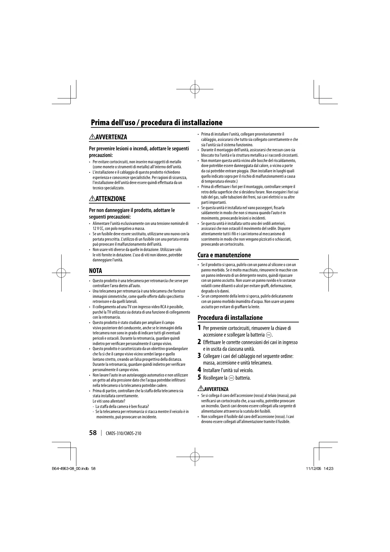 NOTA • Questo prodotto è una telecamera per retromarcia che serve per controllare l'area dietro all'auto. • Una telecamera per retromarcia è una telecamera che fornisce immagini simmetriche, come quelle offerte dallo specchietto retrovisore e da quelli laterali. • Il collegamento ad una TV con ingresso video RCA è possibile, purché la TV utilizzata sia dotata di una funzione di collegamento con la retromarcia. • Questo prodotto è stato studiato per ampliare il campo visivo posteriore del conducente, anche se le immagini della telecamera non sono in grado di indicare tutti gli eventuali pericoli e ostacoli. Durante la retromarcia, guardare quindi indietro per verificare personalmente il campo visivo. • Questo prodotto è caratterizzato da un obiettivo grandangolare che fa sì che il campo visivo vicino sembri largo e quello lontano stretto, creando un falsa prospettiva della distanza. Durante la retromarcia, guardare quindi indietro per verificare personalmente il campo visivo. • Non lavare l'auto in un autolavaggio automatico e non utilizzare un getto ad alta pressione dato che l'acqua potrebbe infiltrarsi nella telecamera o la telecamera potrebbe cadere. • Prima di partire, controllare che la staffa della telecamera sia stata installata correttamente. Le viti sono allentate? - La staffa della camera è ben fissata? - Se la telecamera per retromarcia si stacca mentre il veicolo è in movimento, può provocare un incidente.
