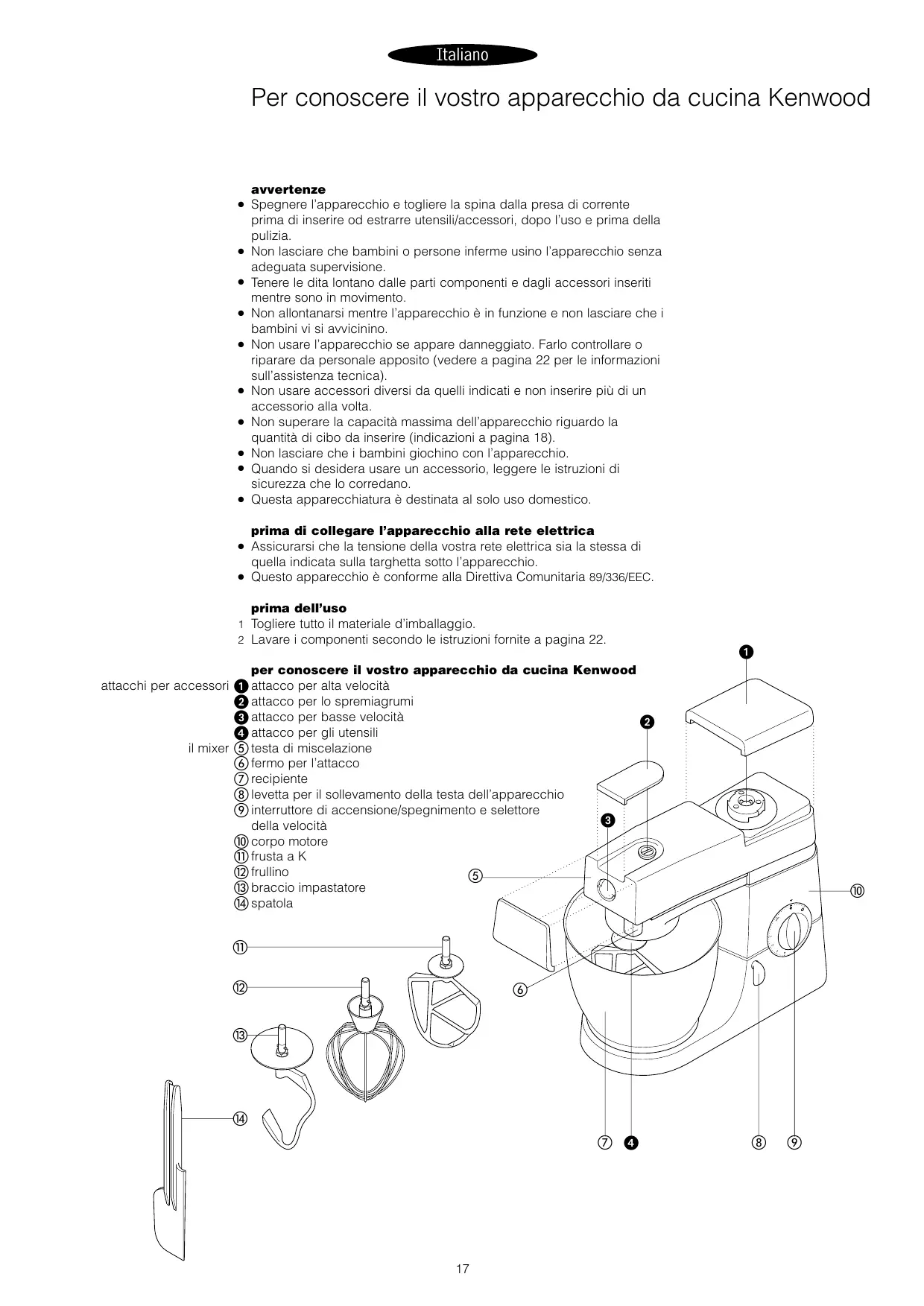 avvertenze Spegnere l’apparecchio e togliere la spina dalla presa di corrente prima di inserire od estrarre utensili/accessori, dopo l’uso e prima della pulizia. Non lasciare che bambini o persone inferme usino l’apparecchio senza adeguata supervisione. Tenere le dita lontano dalle parti componenti e dagli accessori inseriti mentre sono in movimento. Non allontanarsi mentre l’apparecchio è in funzione e non lasciare che i bambini vi si avvicinino. Non usare l’apparecchio se appare danneggiato. Farlo controllare o riparare da personale apposito (vedere a pagina 22 per le informazioni sull’assistenza tecnica). Non usare accessori diversi da quelli indicati e non inserire più di un accessorio alla volta. Non superare la capacità massima dell’apparecchio riguardo la quantità di cibo da inserire (indicazioni a pagina 18). Non lasciare che i bambini giochino con l’apparecchio. Quando si desidera usare un accessorio, leggere le istruzioni di sicurezza che lo corredano. Questa apparecchiatura è destinata al solo uso domestico. prima di collegare l’apparecchio alla rete elettrica Assicurarsi che la tensione della vostra rete elettrica sia la stessa di quella indicata sulla targhetta sotto l’apparecchio. Questo apparecchio è conforme alla Direttiva Comunitaria 89/336/EEC. prima dell’uso 1 Togliere tutto il materiale d’imballaggio. 2 Lavare i componenti secondo le istruzioni fornite a pagina 22. per conoscere il vostro apparecchio da cucina Kenwood attacchi per accessori attacco per alta velocità attacco per lo spremiagrumi attacco per basse velocità attacco per gli utensili il mixer testa di miscelazione fermo per l’attacco recipiente levetta per il sollevamento della testa dell’apparecchio interruttore di accensione/spegnimento e selettore della velocità corpo motore frusta a K frullino braccio impastatore spatola