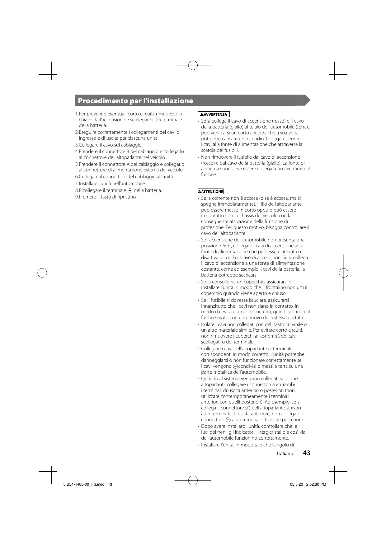 Procedimento per l'installazione 1.Per prevenire eventuali corto circuit, rimuovere la chiave dall'accensione e scollegare il © terminale della batteria. 2.Eseguire correttamente | collegamenti dei cavi di ingresso e di uscita per ciascuna unità. 3.Collegare il cavo sul cablaggio. 4.Prendere il connettore B del cablaggio e collegarlo al connettore dell'altoparlante nel veicole. 5.Prendere il connettore À del cablaggio e collegarlo al connettore di alimentazione esterna del veicolo. 6.Collegare il connettore del cablaggio all'unitè. Z.installare l'unità nell automobile. 8Aicollegare il terminale © della batteria 9.Premere il tasto di ripristino. 5.B54-4468-00_(jindd 43 + Se si collega il cavo di accensione (rosso) € il cavo della batteria (giallo) al telaio dell'automobile (terra), puè verificarsi un corto circuito, che a sua volta potrebbe causare un incendio. Collegare sempre i cavi alla fonte di alimentazione che attraversa la scatola dei fusibil + Non rimuovere il fusibile dal cavo di accensione {rosso) e dal cavo della batteria (giallo). La fonte di alimentazione deve essere collegata ai cavi tramite il fusibile. + Se la corrente non & accesa (o se & accesa, ma si spegne immediatamente), i fil dell'altoparlante pud essere messo in corto oppure pu essere. in contatto con lo chassis del veicolo con la conseguente attivazione della funzione di protezione. Per questo motivo, bisogna controllare il cavo del'aitoparlante. Se l'accensione dell'automobile non presenta una posizione ACC, collegare i cavi di accensione alla fonte di alimentazione che puè essere attivata o disattivata con la chiave di accensione. Se si collega il cavo di accensione à una fonte di alimentazione costante, come ad esempio, i cavi della batteria, la batteria potrebbe scaricarsi Se la consolle ha un coperchio, assicurarsi di installare l'unità in modo che il frontalino non urtiil coperchio quando viene aperto € chiuso. Se il fusibile si dovesse bruciare, assicurarsi innanzitutto che i cavi non siano in contatto, in modo da evitare un corto circuito, quindi sostituire il fusibile usato con uno nuovo della stessa portata. : Isolare 1 cavi non collegati con del nastro in vinile o un altro materiale simile. Per evitare corto circuiti, non rimuovere i coperchi all'estremità dei cavi scollegati o dei terminali Collegare i cavi dell'altoparlante ai terminali corrispondenti in modo corretto. L'unità potrebbe danneggiarsi o non funzionare correttamente se i cavi vengono @tcondivisi o messi a terra su una parte metallica dell'automobil. Quando al sistema vengono collegati solo due altoparlanti, collegare i connettori a entrambi i terminali di uscita anteriori o posteriori (non utilizzare contemporaneamente i terminali anteriori con quel posteriori). Ad esempio, se si collega il connettore ® dell'ltoparlante sinistro à un terminale di uscita anteriore, non collegare i connettore © a un terminale di uscita posteriore. + Dopo avere installato l'unità, controllare che le luci dei fren, gli indicatori, il tergicristallo e cosi via del'automobile funzionino correttamente. + Installare l'unità, in modo tale che l'angolo di Italiano | 43