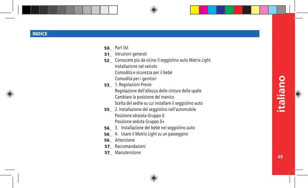 Attenzione Raccomandazioni Manutenzione italiano 50_ Part list 51_ Istruzioni generali 52_ Conoscete più da vicino il seggiolino auto Matrix Light