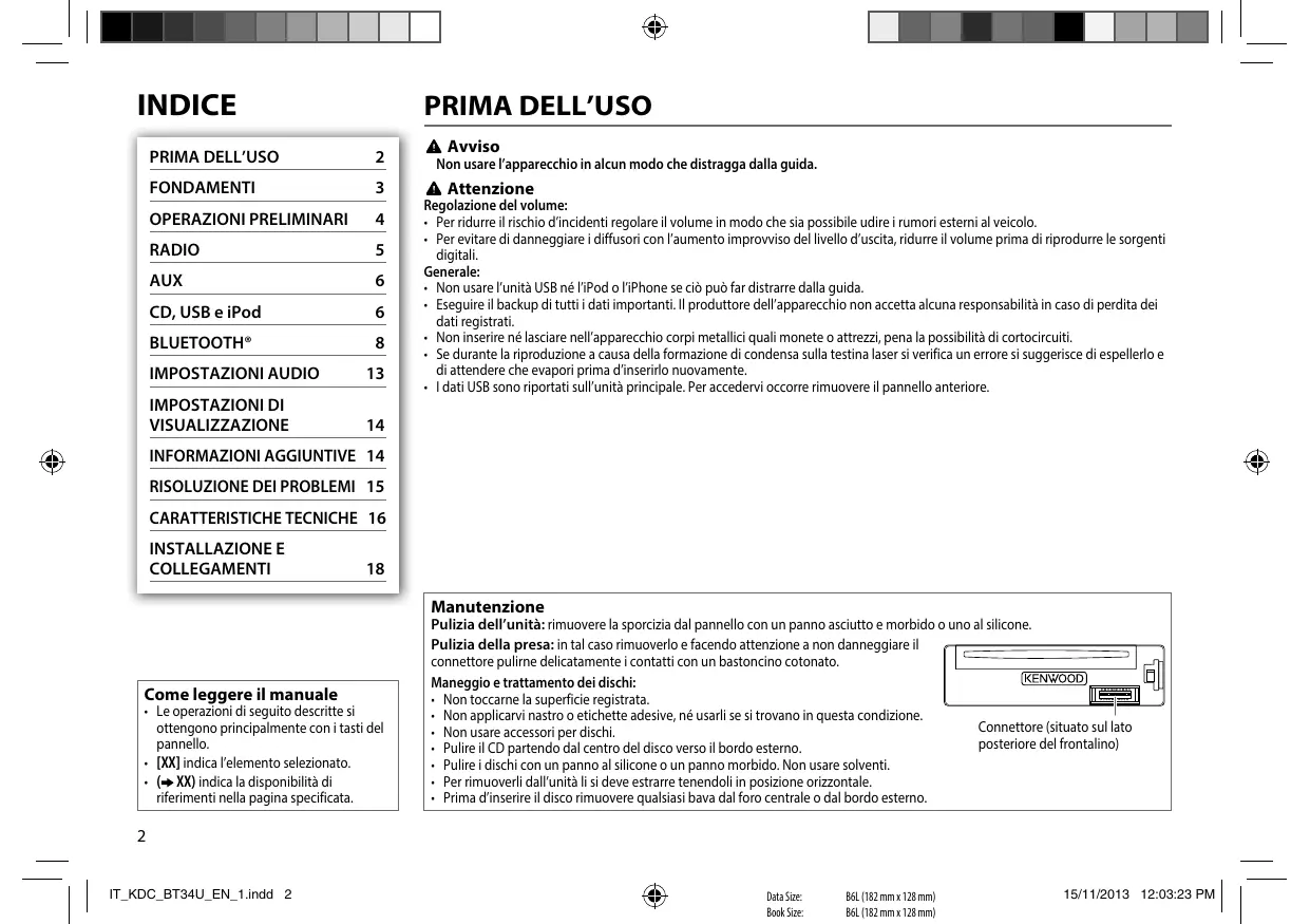 - Questa operazione non è disponibile con i CD audio. Quando durante l’ascolto di TuneIn Radio, TuneIn Radio Pro o Aupeo si collega l’iPod o l’iPhone al connettore USB dell’apparecchio quest’ultimo riproduce il suono di tale applicazione. ITALIANO | IT_KDC_BT34U_EN_1.indd 7 Data Size: Book Size: B6L (182 mm x 128 mm) B6L (182 mm x 128 mm)