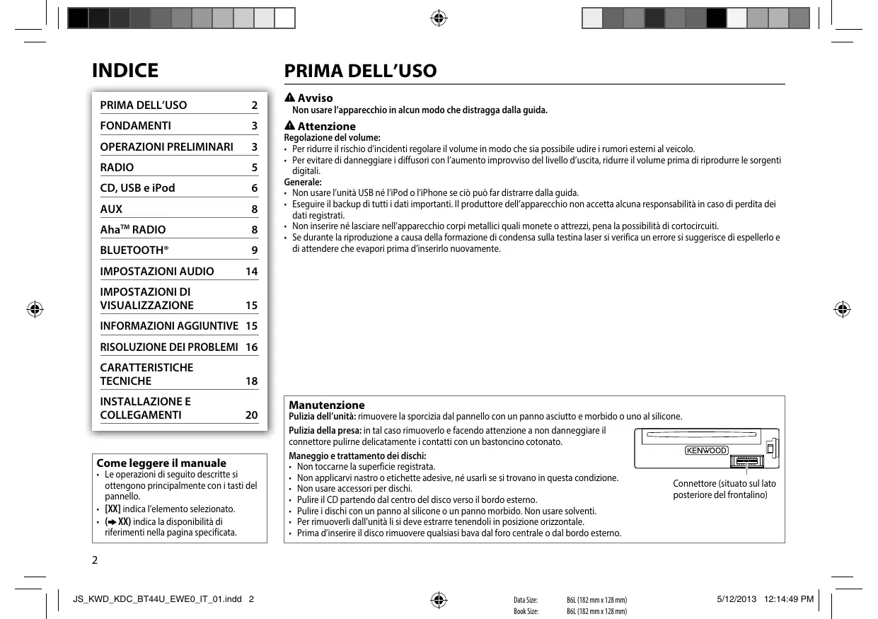 - Se si regola il volume durante la ricezione delle informazioni sul traffico o mentre si sta ricevendo un notiziario o un servizio allarmi, l’apparecchio lo memorizza automaticamente. Ripristinerà quindi lo stesso volume la volta successiva che si accederà agli stessi tipi di programma. ITALIANO | JS_KWD_KDC_BT44U_EWE0_IT_01.indd 5 Data Size: Book Size: B6L (182 mm x 128 mm) B6L (182 mm x 128 mm)