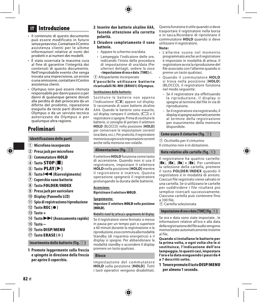 - Lampeggia l’indicatore delle ore, indicando l’inizio della procedura di impostazione di ora/data (Per ulteriori dettagli, vedere la voce «Impostazione di ora e data [TIME]»). 1 Altoparlante incorporato E ’p o s s i b i l e u t i l i z z a r e b a t t e r i e ricaricabili Ni-MH (BR401) Olympus. Sostituzione delle batterie: S o s t i t u i r e l e b at te r i e n o n a p p e n a l’indicazione [N] appare sul display. Si raccomanda di usare batterie alcaline AAA. Quando le batterie sono esaurite, sul display compare il simbolo, [O] e il registratore si spegne. Prima di sostituire le batterie, si consiglia di portare il selettore HOLD (BLOCCO) nella posizione [HOLD] per conservare le impostazioni correnti (ora/data, ecc.). Per praticità, il registratore memorizza ogni ora le impostazioni correnti anche nella memoria non volatile. Alimentazione (fig. 2) Il selettore HOLD funziona come tasto di accensione. Quando non si usa il registratore, impostare il selettore HOLD nella posizione [HOLD] mentre il registratore è inat tivo. Questa operazione spegnerà il registratore prolungando la durata delle batterie. Accensione: Ripristinare il selettore HOLD. Spegnimento: Impostare il selettore HOLD nella posizione [HOLD]. Modalità stand-by (attesa) e spegnimento del display: Se il registratore viene fermato o messo in pausa per un tempo pari o superiore a 60 minuti durante la registrazione o la riproduzione, esso commuta alla modalità Standby (di risparmio energetico) e il display si spegne. Per abbandonare la modalità standby e accendere il display premere un tasto qualsiasi. Blocco I m p os t a z i o n e d e l co m m u t ato r e HOLD sulla posizione [HOLD]. Tutti i tasti operativi vengono disabilitati. Questa funzione è utile quando si deve trasportare il registratore nella borsa o in tasca.Ricordarsi di ripristinare il commutatore HOLD quando si deve utilizzare il registratore. Note:
