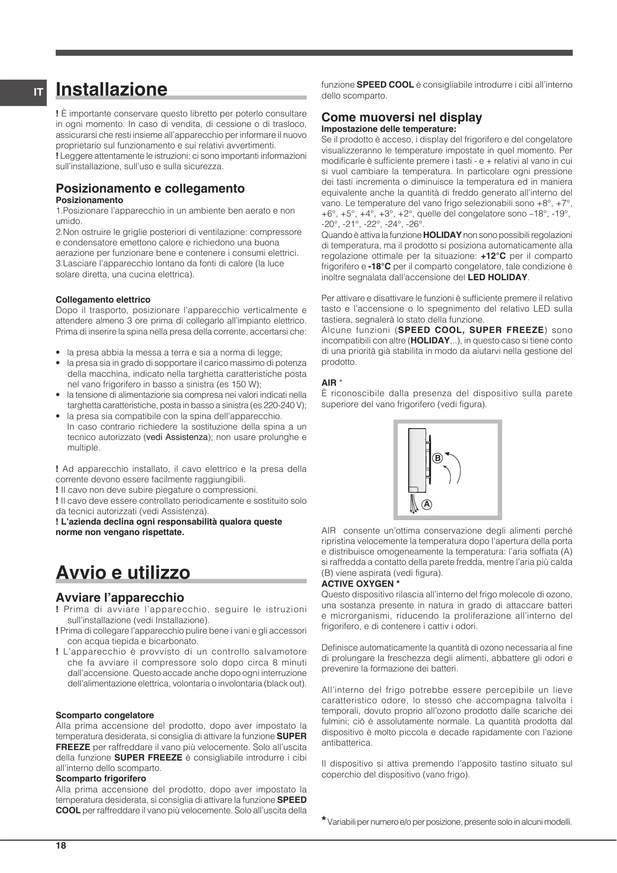 A AIR consente un’ottima conservazione degli alimenti perché ripristina velocemente la temperatura dopo l’apertura della porta e distribuisce omogeneamente la temperatura: l’aria soffiata (A) si raffredda a contatto della parete fredda, mentre l’aria più calda (B) viene aspirata (vedi figura). ACTIVE OXYGEN * Questo dispositivo rilascia all’interno del frigo molecole di ozono, una sostanza presente in natura in grado di attaccare batteri e microrganismi, riducendo la proliferazione all’interno del frigorifero, e di contenere i cattiv i odori. Definisce automaticamente la quantità di ozono necessaria al fine di prolungare la freschezza degli alimenti, abbattere gli odori e prevenire la formazione dei batteri. All’interno del frigo potrebbe essere percepibile un lieve caratteristico odore, lo stesso che accompagna talvolta i temporali, dovuto proprio all’ozono prodotto dalle scariche dei fulmini; ciò è assolutamente normale. La quantità prodotta dal dispositivo è molto piccola e decade rapidamente con l’azione antibatterica. Il dispositivo si attiva premendo l’apposito tastino situato sul coperchio del dispositivo (vano frigo).