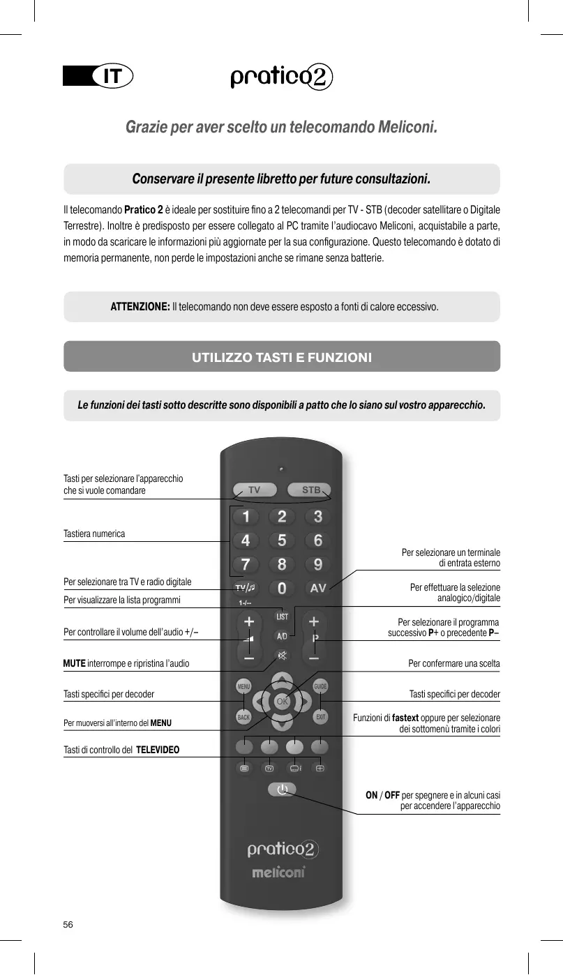 Grazie per aver scelto un telecomando Meliconi. Conservare il presente libretto per future consultazioni. Il telecomando Pratico 2 è ideale per sostituire fino a 2 telecomandi per TV - STB (decoder satellitare o Digitale Terrestre). Inoltre è predisposto per essere collegato al PC tramite l’audiocavo Meliconi, acquistabile a parte, in modo da scaricare le informazioni più aggiornate per la sua configurazione. Questo telecomando è dotato di memoria permanente, non perde le impostazioni anche se rimane senza batterie. ATTENZIONE: Il telecomando non deve essere esposto a fonti di calore eccessivo.