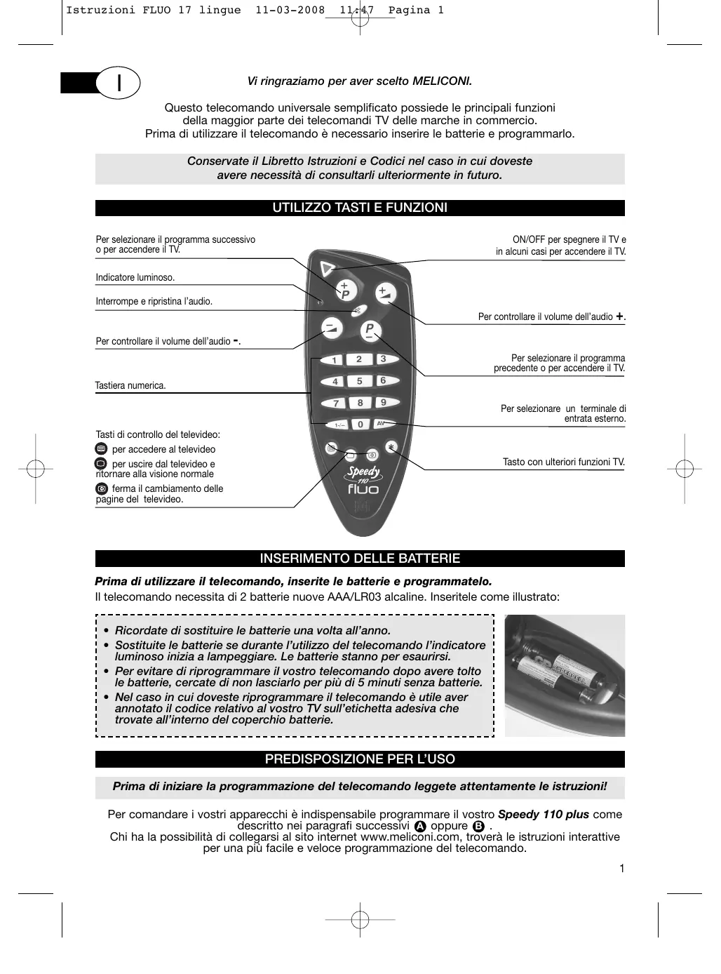 11-03-2008 11:47 Pagina 1 Vi ringraziamo per aver scelto MELICONI. Questo telecomando universale semplificato possiede le principali funzioni della maggior parte dei telecomandi TV delle marche in commercio. Prima di utilizzare il telecomando è necessario inserire le batterie e programmarlo. Conservate il Libretto Istruzioni e Codici nel caso in cui doveste avere necessità di consultarli ulteriormente in futuro.