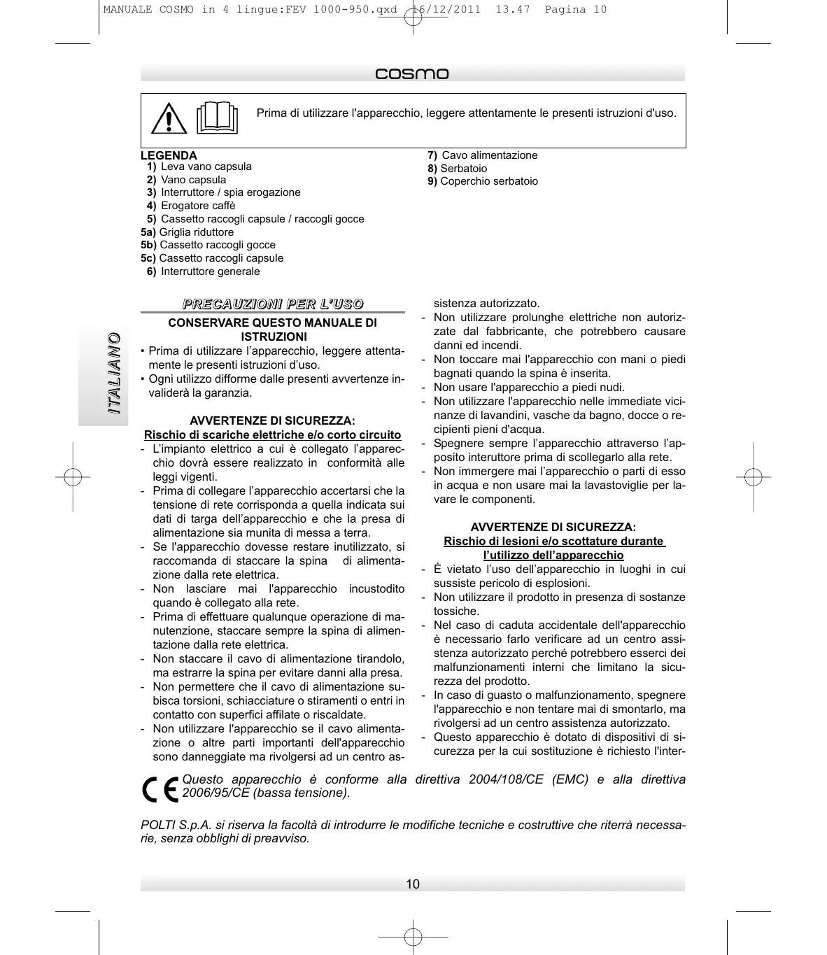 I TA L I A N O U S O C O R R E T TO D E L P R O D O T TO Questo apparecchio è destinato all’uso domestico secondo le descrizioni ed istruzioni riportate in questo manuale. Si prega di leggere attentamente queste istruzioni e di conservarle, Le potrebbero essere utili in futuro. Polti S.p.A. declina tutte le responsabilità in caso di incidenti derivanti da un utilizzo di questo apparecchio non conforme alle presenti istruzioni d’uso. MANUALE COSMO in 4 lingue:FEV 1000-950.qxd 16/12/2011