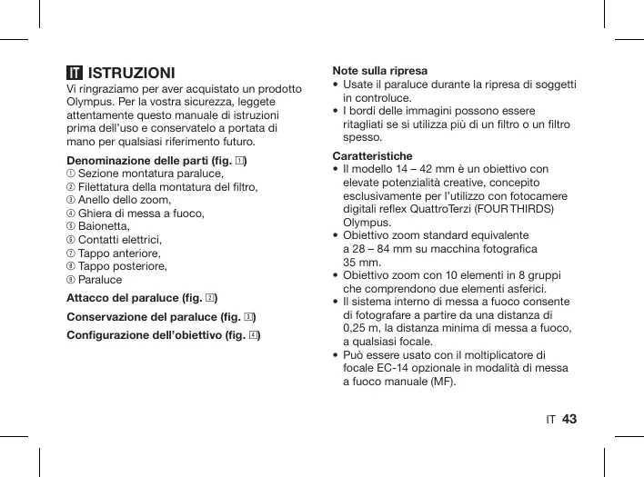 Scarica le istruzioni per il tuo Obiettivo fotografico in formato PDF gratuitamente! Trova il tuo manuale ZUIKO DIGITAL ED 14 - OLYMPUS e riprendi in mano il tuo dispositivo elettronico. In questa pagina sono pubblicati tutti i documenti necessari per l'utilizzo del tuo dispositivo. ZUIKO DIGITAL ED 14 del marchio OLYMPUS.