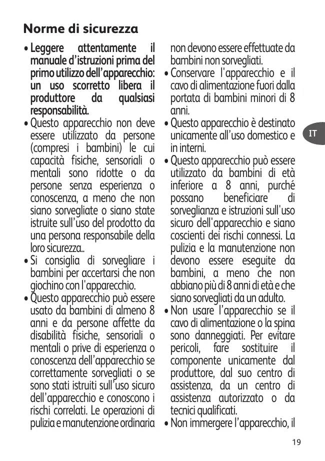 - Questo apparecchio può essere usato da bambini di almeno 8 anni e da persone affette da disabilità fisiche, sensoriali o mentali o prive di esperienza o conoscenza dell’apparecchio se correttamente sorvegliati o se sono stati istruiti sull’uso sicuro dell’apparecchio e conoscono i rischi correlati. Le operazioni di pulizia e manutenzione ordinaria non devono essere effettuate da bambini non sorvegliati.