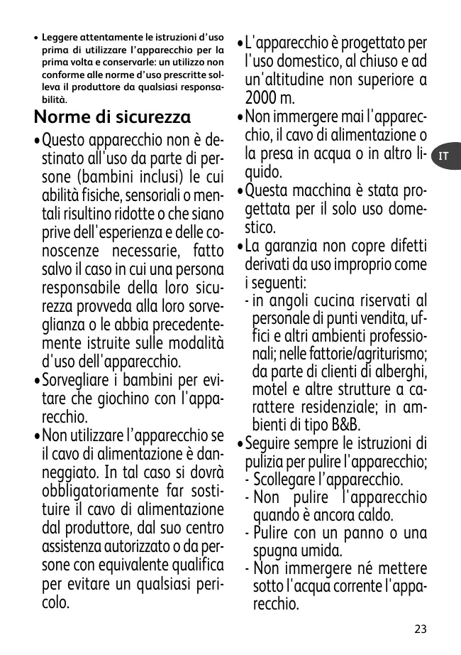 à 2000 m. • Ne pas mettre l’appareil, le câble d’alimentation ou la fiche dans l’eau ou tout autre liquide. • Votre machine a été conçue pour un usage domestique seulement. • Elle n’a pas été conçue pour être utilisée dans les cas suivants qui ne sont pas couverts par la garantie: - Dans des coins de cuisines réservés au personnel dans des magasins, bureaux et autres environnements professionnels ; Dans des fermes ; Par les clients des hôtels, motels et autres environnements à caractère résidentiel ; Dans des environnements de type chambres d’hôtes. • Toujours suivre les instructions de nettoyage pour nettoyer votre appareil; - Débrancher l’appareil. - Ne pas nettoyer l’appareil chaud. - Nettoyer avec un chiffon ou une éponge humide. 7