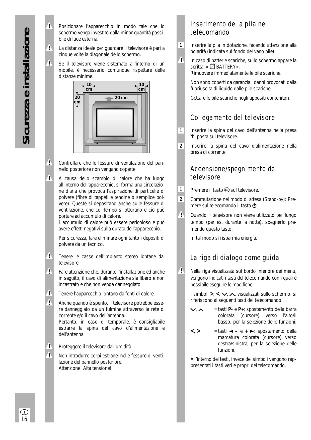 Fare attenzione che, durante l’installazione ed anche in seguito, il cavo di alimentazione sia libero e non incastrato e che non venga danneggiato. Tenere l’apparecchio lontano da fonti di calore. Anche quando è spento, il televisore potrebbe essere danneggiato da un fulmine attraverso la rete di corrente e/o il cavo dell’antenna. Pertanto, in caso di temporale, è consigliabile estrarre la spina del cavo d’alimentazione e dell’antenna. Proteggere il televisore dall’umidità. Non introdurre corpi estranei nelle fessure di ventilazione del pannello posteriore. Attenzione! Alta tensione!