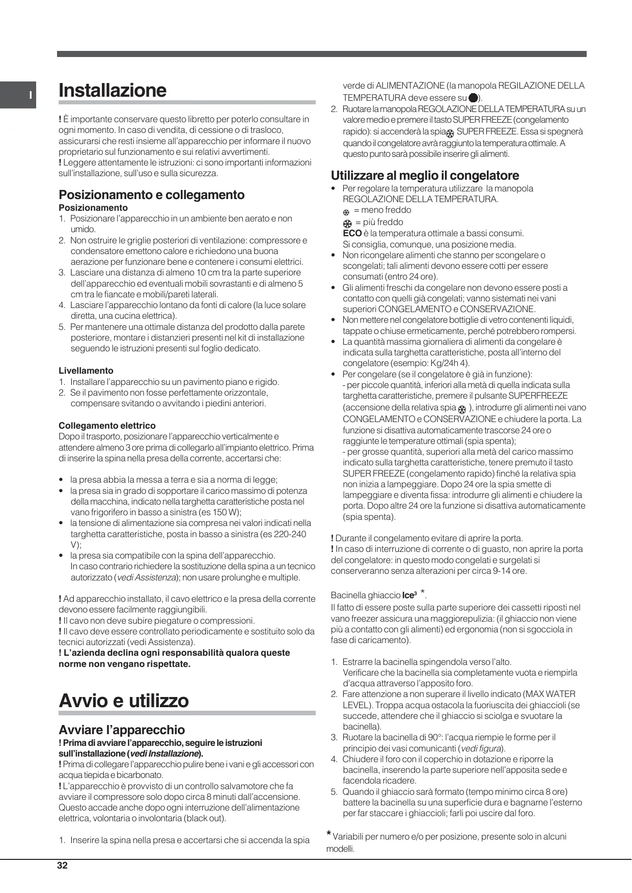 I Installazione ! È importante conservare questo libretto per poterlo consultare in ogni momento. In caso di vendita, di cessione o di trasloco, assicurarsi che resti insieme all’apparecchio per informare il nuovo proprietario sul funzionamento e sui relativi avvertimenti. ! Leggere attentamente le istruzioni: ci sono importanti informazioni sull’installazione, sull’uso e sulla sicurezza.