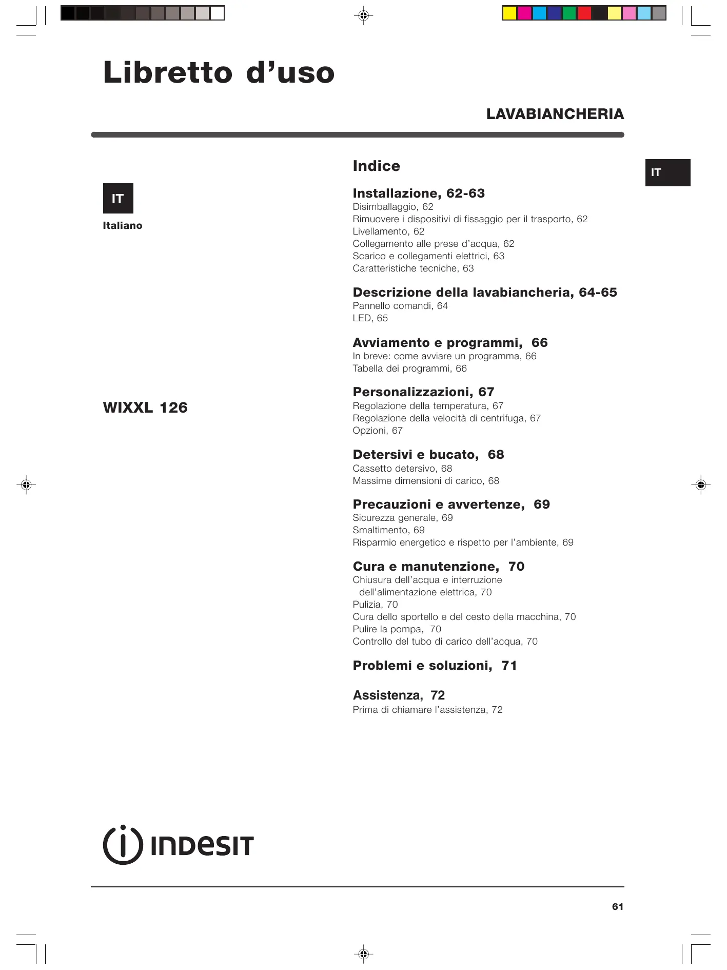 Scarica le istruzioni per il tuo Lavatrice in formato PDF gratuitamente! Trova il tuo manuale WIXXL126 - INDESIT e riprendi in mano il tuo dispositivo elettronico. In questa pagina sono pubblicati tutti i documenti necessari per l'utilizzo del tuo dispositivo. WIXXL126 del marchio INDESIT.