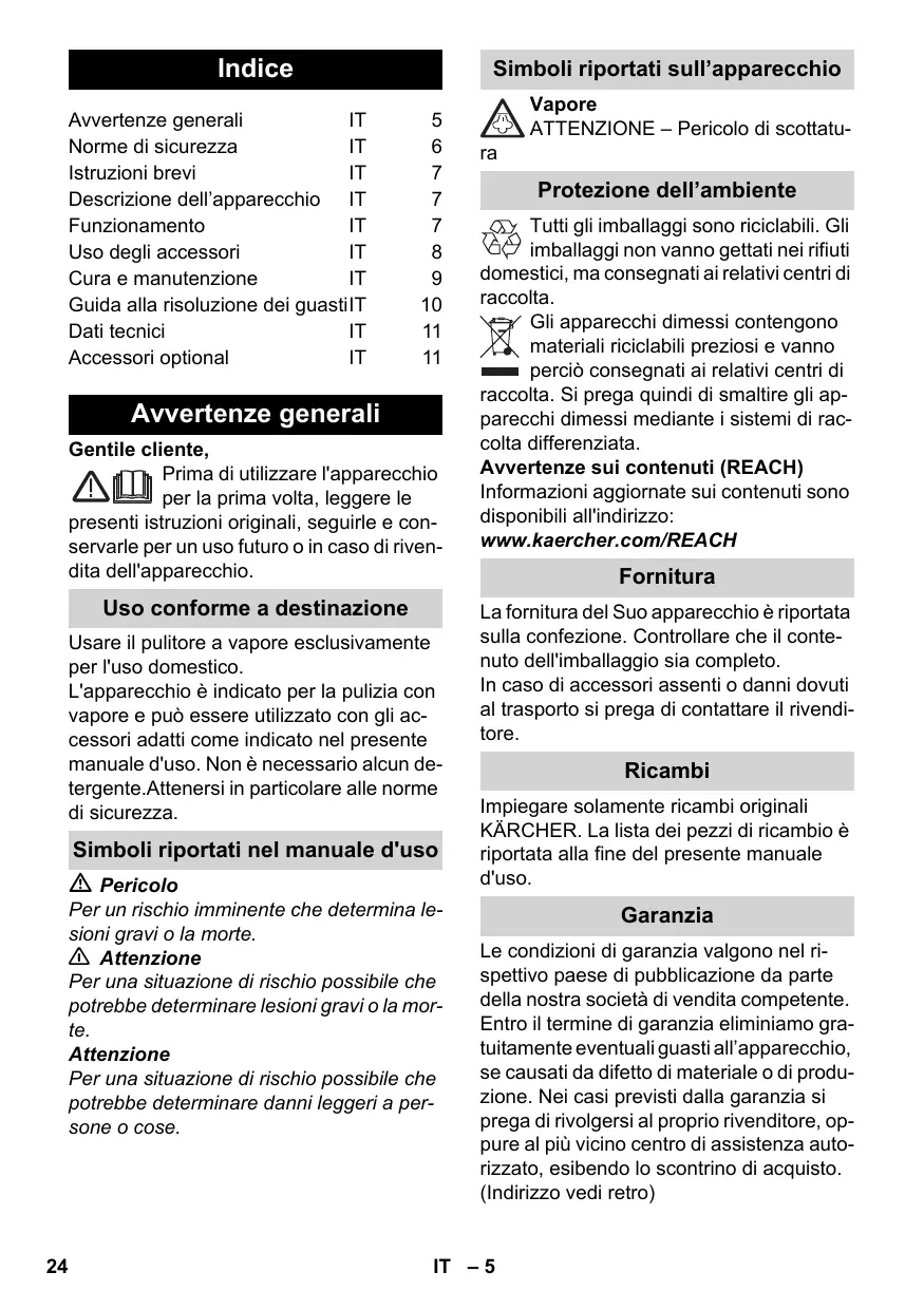 Vapore ATTENZIONE – Pericolo di scottatura Protezione dell’ambiente Tutti gli imballaggi sono riciclabili. Gli imballaggi non vanno gettati nei rifiuti domestici, ma consegnati ai relativi centri di raccolta. Gli apparecchi dimessi contengono materiali riciclabili preziosi e vanno perciò consegnati ai relativi centri di raccolta. Si prega quindi di smaltire gli apparecchi dimessi mediante i sistemi di raccolta differenziata. Avvertenze sui contenuti (REACH) Informazioni aggiornate sui contenuti sono disponibili all'indirizzo: www.kaercher.com/REACH Fornitura La fornitura del Suo apparecchio è riportata sulla confezione. Controllare che il contenuto dell'imballaggio sia completo. In caso di accessori assenti o danni dovuti al trasporto si prega di contattare il rivenditore. Ricambi Impiegare solamente ricambi originali KÄRCHER. La lista dei pezzi di ricambio è riportata alla fine del presente manuale d'uso. Garanzia Le condizioni di garanzia valgono nel rispettivo paese di pubblicazione da parte della nostra società di vendita competente. Entro il termine di garanzia eliminiamo gratuitamente eventuali guasti all’apparecchio, se causati da difetto di materiale o di produzione. Nei casi previsti dalla garanzia si prega di rivolgersi al proprio rivenditore, oppure al più vicino centro di assistenza autorizzato, esibendo lo scontrino di acquisto. (Indirizzo vedi retro) IT – 5 Norme di sicurezza Pericolo E' vietato l'utilizzo in ambienti a rischio di esplosione. Se l'apparecchio viene usato in zone di pericolo è necessario osservare le disposizioni di sicurezza vigenti. Non utilizzare l'apparecchio in piscine contenenti acqua. L'apparecchio non deve essere utilizzato per la pulizia di apparecchi elettrici come ad es. forni, cappe di aspirazione, forni a microonde, televisori, lampade, fon, caloriferi elettrici, ecc. Verificare il perfetto stato dell'apparecchio e degli accessori prima della messa in funzione. In caso contrario è vietato usarlo. Si prega di controllare in particolare il cavo di alimentazione, il tappo di chiusura di sicurezza ed il tubo vapore. Far sostituire immediatamente il cavo di allacciamento alla rete danneggiato dal servizio clienti autorizzato/da un elettricista specializzato. Sostituire immediatamente il tubo vapore danneggiato. Usare esclusivamente un tubo vapore raccomandato dal produttore (codice d'ordinazione: vedi elenco ricambi). Non toccare mai la spina e la presa con le mani bagnate. Non usare il vapore per pulire oggetti che contengono sostanze dannose per la salute (p.es. amianto). Non toccare mai il getto di vapore a distanza ravvicinata e non puntarlo su persone o animali (pericolo di scottature). 몇 Attenzione Allacciare l'apparecchio solo ad un collegamento elettrico installato da un installatore elettrico in conformità alla norma IEC 60364. Collegare l'apparecchio solo a corrente alternata. La tensione deve corrispondere a quella indicata sulla targhetta dell'apparecchio. Per l'uso all'interno di ambienti umidi, p. es. bagni, collegare l'apparecchio a prese dotate di interruttore differenziale a monte (salvavita). Prolunghe non adatte possono risultare pericolose. Usare esclusivamente cavi di prolunga protetti contro gli spruzzi d'acqua. Sezione minima: 3x1 mm². Il collegamento tra il cavo di alimentazione ed il cavo prolunga non deve venire a contatto con l'acqua. La protezione contro gli spruzzi d'acqua e la resistenza meccanica deve essere garantita anche dopo l'eventuale sostituzione di giunti del cavo diallacciamento alla rete o del cavo di prolunga. L'operatore deve utilizzare l'apparecchio in modo conforme a destinazione. Deve tener conto delle condizioni presenti in loco e durante il lavoro con l'apparecchio fare attenzione alle persone nelle vicinanze. Questo apparecchio non è indicato per essere usato da persone con delle limitate capacità fisiche, sensoriali o mentali e da persone che abbiano poca esperienza e/o conoscenza dello strumento a meno che non vengano supervisionati per la loro sicurezza da una persona incaricata o che abbiano da questa ricevuto istruzioni su come usare l'apparecchio. I bambini possono utilizzare l'apparecchio soltanto se sono maggiori di 8 anni e vengono supervisionati per la loro sicurezza da una persona incaricata o che abbiano da questa ricevuto istruzioni su come usare. Non lasciare mai l'apparecchio incustodito quando è acceso. Fare attenzione durante la pulizia di pareti piastrellate in presenza di prese. Attenzione Prestare attenzione che il cavo di allacciamento alla rete o il cavo prolunga non vengano danneggiati passandovi sopra, schiacciandoli, tirandoli o simili. Proteggere i cavi di rete contro il caldo eccessivo, olio e spigoli vivi. Non versare mai solventi, liquidi contenenti solventi o acidi allo stato puro (p.es. detergenti, benzina, diluenti per vernici e acetone) nel serbatoio dell'acqua, in quanto corrodono i materiali dell'apparecchio. Non bloccare la leva vapore durante l'uso. IT – 6