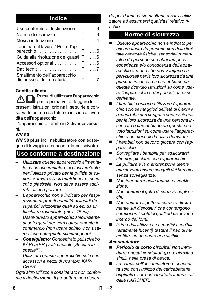 Gentile cliente, Prima di utilizzare l'apparecchio per la prima volta, leggere le presenti istruzioni originali, seguirle e conservarle per un uso futuro o in caso di rivendita dell'apparecchio. L'apparecchio è fornito in 2 diverse versioni. WV 50 WV 50 plus incl. nebulizzatore con sostegno di lavaggio e concentrato puliscivetro Uso conforme a destinazione Utilizzare questo apparecchio alimentato da un accumulatore esclusivamtente per l'utilizzo privato per la pulizia di superfici umide e lisce quali finestre, specchi o piastrelle. Non deve essere aspirata alcuna polvere. – L'apparecchio non è indicato per l'aspirazione di grandi quantità di liquidi da superfici orizzontali quali ad es. da un bicchiere rovesciato (max. 25 ml). – Usare questo apparecchio solo insieme ai detergenti per vetri comunemente in commercio (non usare spirito, non usare alcun detergente schiumogeno). – Consigliamo: Concentrato puliscivetro KÄRCHER (vedi capitolo „Accessori speciali“). – Utilizzate questo apparecchio solo con accessori e pezzi di ricambio KÄRCHER. Ogni altro utilizzo è considerato non conforme a destinazione. Il produttore non rispon–