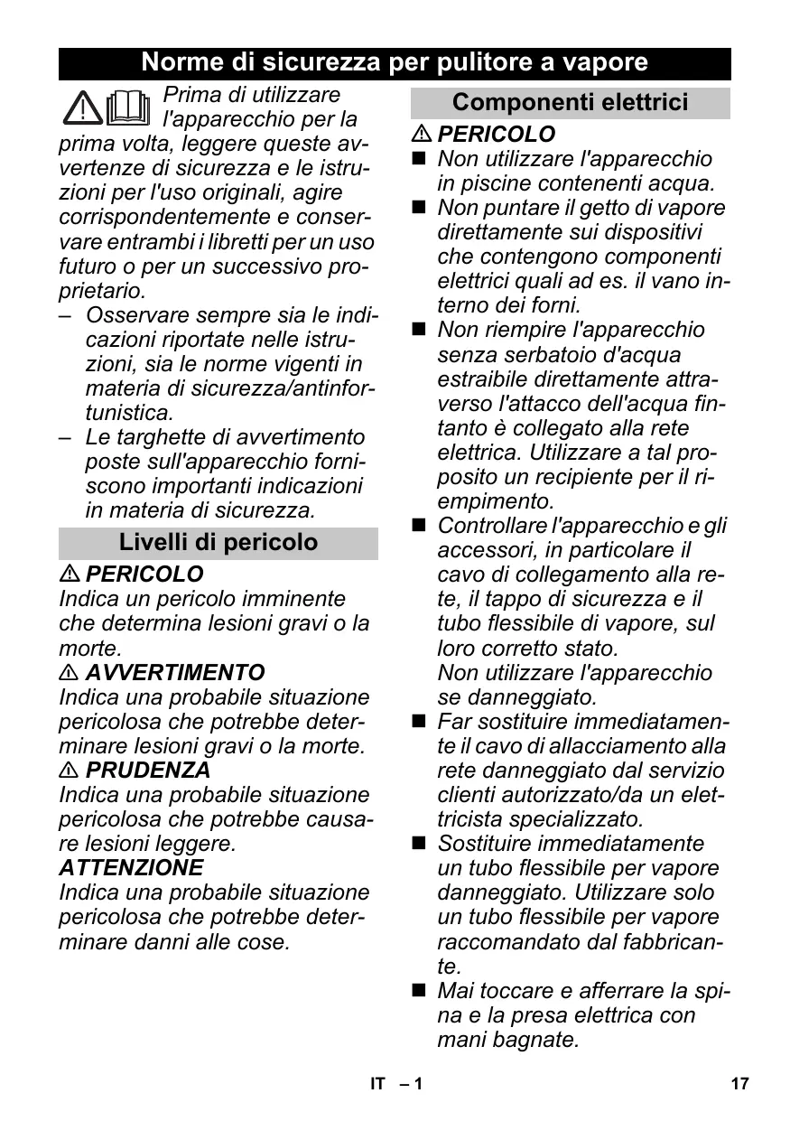 FR – 5 symptômes caractéristiques (par exemple une fourmillements dans les doigts, les doigts froids), nous recommandons de consulter un médecin. Norme di sicurezza per pulitore a vapore Prima di utilizzare l'apparecchio per la prima volta, leggere queste avvertenze di sicurezza e le istruzioni per l'uso originali, agire corrispondentemente e conservare entrambi i libretti per un uso futuro o per un successivo proprietario. – Osservare sempre sia le indicazioni riportate nelle istruzioni, sia le norme vigenti in materia di sicurezza/antinfortunistica. – Le targhette di avvertimento poste sull'apparecchio forniscono importanti indicazioni in materia di sicurezza. Livelli di pericolo PERICOLO Indica un pericolo imminente che determina lesioni gravi o la morte. 몇 AVVERTIMENTO Indica una probabile situazione pericolosa che potrebbe determinare lesioni gravi o la morte. 몇 PRUDENZA Indica una probabile situazione pericolosa che potrebbe causare lesioni leggere. ATTENZIONE Indica una probabile situazione pericolosa che potrebbe determinare danni alle cose. Componenti elettrici PERICOLO Non utilizzare l'apparecchio in piscine contenenti acqua. Non puntare il getto di vapore direttamente sui dispositivi che contengono componenti elettrici quali ad es. il vano interno dei forni. Non riempire l'apparecchio senza serbatoio d'acqua estraibile direttamente attraverso l'attacco dell'acqua fintanto è collegato alla rete elettrica. Utilizzare a tal proposito un recipiente per il riempimento. Controllare l'apparecchio e gli accessori, in particolare il cavo di collegamento alla rete, il tappo di sicurezza e il tubo flessibile di vapore, sul loro corretto stato. Non utilizzare l'apparecchio se danneggiato. Far sostituire immediatamente il cavo di allacciamento alla rete danneggiato dal servizio clienti autorizzato/da un elettricista specializzato. Sostituire immediatamente un tubo flessibile per vapore danneggiato. Utilizzare solo un tubo flessibile per vapore raccomandato dal fabbricante. Mai toccare e afferrare la spina e la presa elettrica con mani bagnate. IT – 1