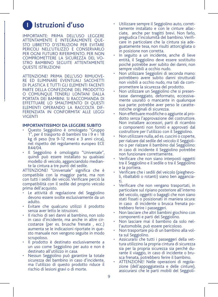 N° 44, amendements série 04. Adapté à l’emploi général dans les véhicules et compatibles avec la plupart des sièges de véhicule, avec des exceptions possibles. 2. On peut obtenir plus facilement une parfaite compatibilité dans les cas où le fabricant du véhicule déclare dans la notice d’utilisation du véhicule que celui-ci est prévu pour l’installation de dispositifs de maintien d’enfants “Universels” pour la tranche d’âge en question. 3. Ce dispositif de maintien a été classé “Universel” selon des critères d’homologation plus sévères que pour les modèles précédents qui ne disposent pas de la même mention. 4. Adapté uniquement à l’emploi dans les véhicules munis d’une ceinture de sécurité à 3 points, statique ou à enrouleur, homologuée conformément au Règlement UN/ECE N° 16 ou autres standards équivalents. 5. En cas de doute, contacter le fabricant du dispositif de retenue ou le revendeur. MODE D’EMPLOI • Éléments • Limitations et conditions d’utilisation relatives au siège-auto et au siège de la voiture • Installer le siège-auto dans la voiture • Avertissements importants pour installer correctement le siège-auto • Placer correctement l’enfant dans le siègeauto • Régler le coussin appui-tête et le harnais • Régler l’inclinaison de l’assise • Entretien ÉLÉMENTS (Fig. 1-2-3) Fig. 1 (Devant) E. Bouton de réglage de la longueur des ceintures F. Courroie de réglage des ceintures G. Boucle de fermeture/ouverture des ceintures H. Housse I. Entrejambes capitonné 15 Vérifier ensuite que l’enrouleur de la ceinture se trouve en position reculée (ou alignée au maximum) par rapport au dossier du siège de la voiture. Si le siège avant dispose d’un airbag frontal, nous déconseillons d’y installer le siège-auto. En cas d’installation sur un siège quelconque, protégé par un airbag, toujours consulter la notice d’utilisation de la voiture pour connaître les précautions et conseils d’utilisation éventuels. ATTENTION ! Ne jamais installer le siègeauto sur un siège de voiture muni uniquement d’une ceinture horizontale à deux points d’ancrage (Fig. 6)