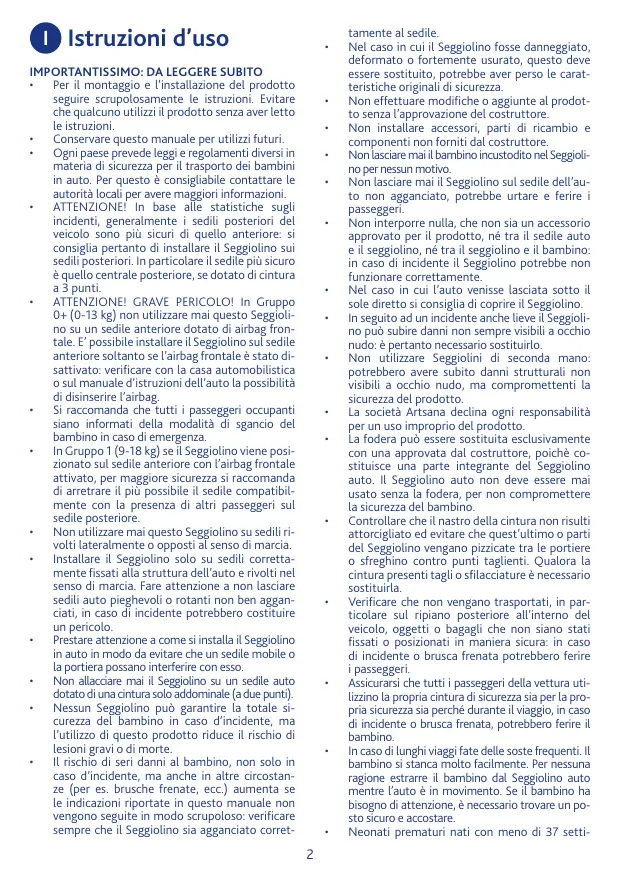 tamente al sedile. Nel caso in cui il Seggiolino fosse danneggiato, deformato o fortemente usurato, questo deve essere sostituito, potrebbe aver perso le caratteristiche originali di sicurezza. Non effettuare modifiche o aggiunte al prodotto senza l’approvazione del costruttore. Non installare accessori, parti di ricambio e componenti non forniti dal costruttore. Non lasciare mai il bambino incustodito nel Seggiolino per nessun motivo. Non lasciare mai il Seggiolino sul sedile dell’auto non agganciato, potrebbe urtare e ferire i passeggeri. Non interporre nulla, che non sia un accessorio approvato per il prodotto, né tra il sedile auto e il seggiolino, né tra il seggiolino e il bambino: in caso di incidente il Seggiolino potrebbe non funzionare correttamente. Nel caso in cui l’auto venisse lasciata sotto il sole diretto si consiglia di coprire il Seggiolino. In seguito ad un incidente anche lieve il Seggiolino può subire danni non sempre visibili a occhio nudo: è pertanto necessario sostituirlo. Non utilizzare Seggiolini di seconda mano: potrebbero avere subito danni strutturali non visibili a occhio nudo, ma compromettenti la sicurezza del prodotto. La società Artsana declina ogni responsabilità per un uso improprio del prodotto. La fodera può essere sostituita esclusivamente con una approvata dal costruttore, poichè costituisce una parte integrante del Seggiolino auto. Il Seggiolino auto non deve essere mai usato senza la fodera, per non compromettere la sicurezza del bambino. Controllare che il nastro della cintura non risulti attorcigliato ed evitare che quest’ultimo o parti del Seggiolino vengano pizzicate tra le portiere o sfreghino contro punti taglienti. Qualora la cintura presenti tagli o sfilacciature è necessario sostituirla. Verificare che non vengano trasportati, in particolare sul ripiano posteriore all’interno del veicolo, oggetti o bagagli che non siano stati fissati o posizionati in maniera sicura: in caso di incidente o brusca frenata potrebbero ferire i passeggeri. Assicurarsi che tutti i passeggeri della vettura utilizzino la propria cintura di sicurezza sia per la propria sicurezza sia perché durante il viaggio, in caso di incidente o brusca frenata, potrebbero ferire il bambino. In caso di lunghi viaggi fate delle soste frequenti. Il bambino si stanca molto facilmente. Per nessuna ragione estrarre il bambino dal Seggiolino auto mentre l’auto è in movimento. Se il bambino ha bisogno di attenzione, è necessario trovare un posto sicuro e accostare. Neonati prematuri nati con meno di 37 setti-