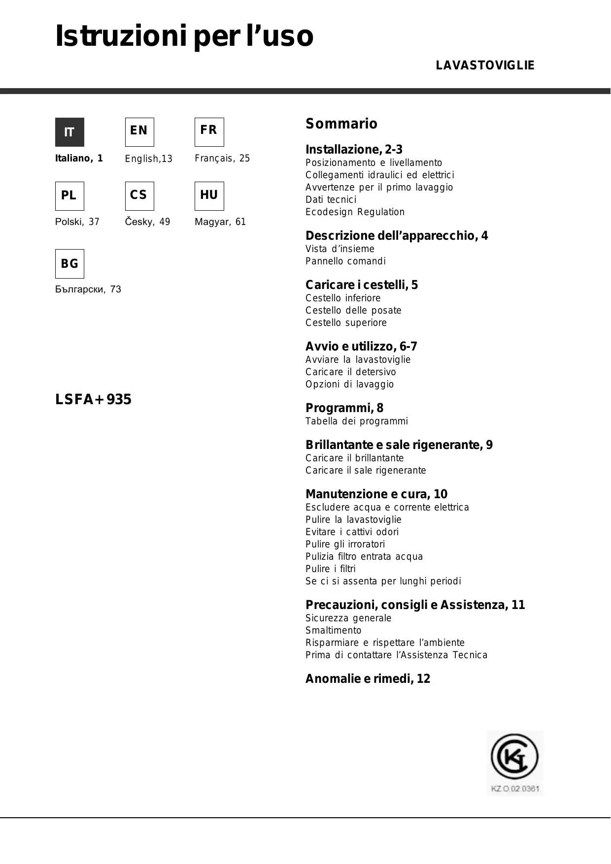 LSFA 935 EU/HA - Lavastoviglie HOTPOINT - Manuale utente e istruzioni gratuiti