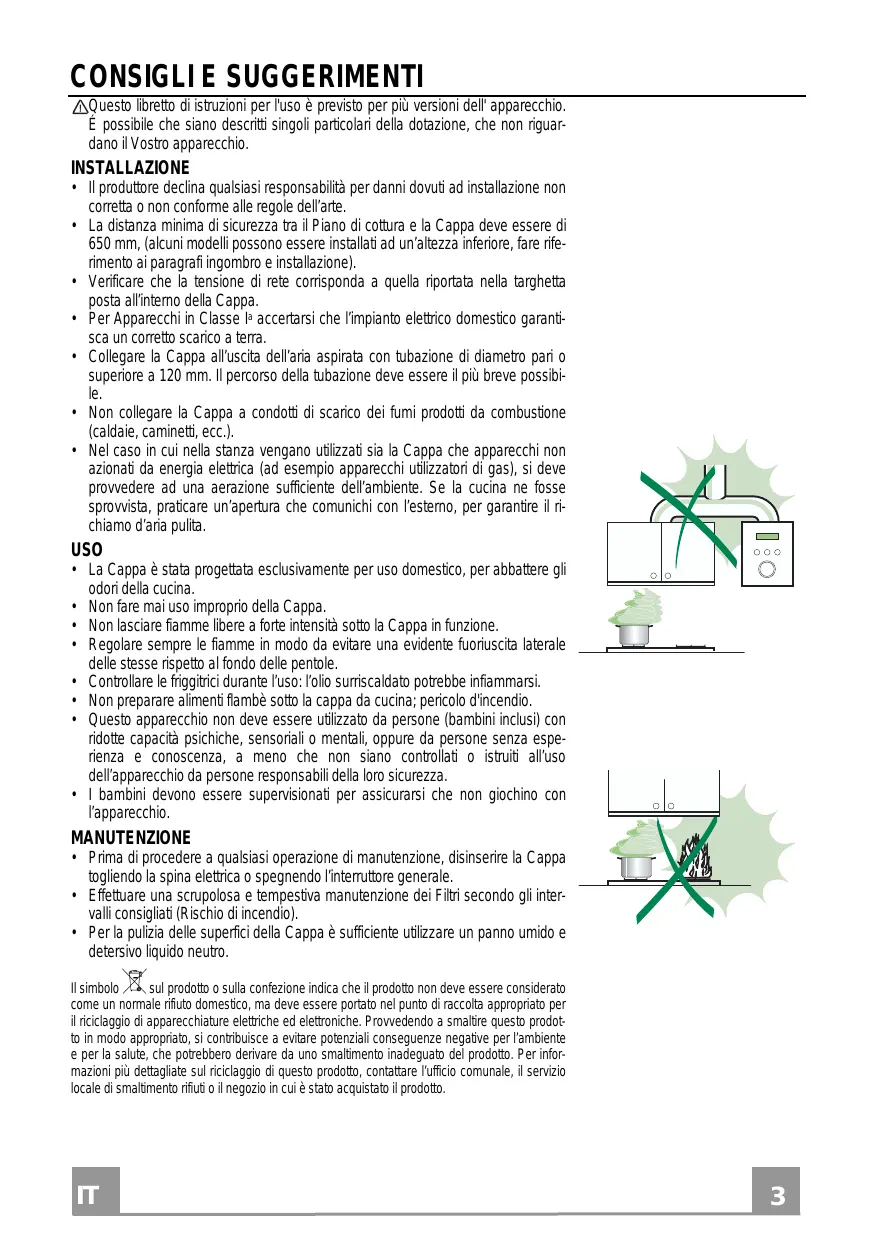 - Per la pulizia delle superfici della Cappa è sufficiente utilizzare un panno umido e detersivo liquido neutro. Il simbolo sul prodotto o sulla confezione indica che il prodotto non deve essere considerato come un normale rifiuto domestico, ma deve essere portato nel punto di raccolta appropriato per il riciclaggio di apparecchiature elettriche ed elettroniche. Provvedendo a smaltire questo prodotto in modo appropriato, si contribuisce a evitare potenziali conseguenze negative per l’ambiente e per la salute, che potrebbero derivare da uno smaltimento inadeguato del prodotto. Per informazioni più dettagliate sul riciclaggio di questo prodotto, contattare l’ufficio comunale, il servizio locale di smaltimento rifiuti o il negozio in cui è stato acquistato il prodotto.