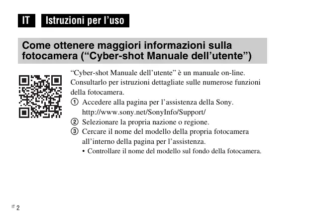 Istruzioni per l’uso Come ottenere maggiori informazioni sulla fotocamera (“Cyber-shot Manuale dell’utente”) “Cyber-shot Manuale dell’utente” è un manuale on-line. Consultarlo per istruzioni dettagliate sulle numerose funzioni della fotocamera. 1 Accedere alla pagina per l’assistenza della Sony. http://www.sony.net/SonyInfo/Support/ 2 Selezionare la propria nazione o regione. 3 Cercare il nome del modello della propria fotocamera all’interno della pagina per l’assistenza.