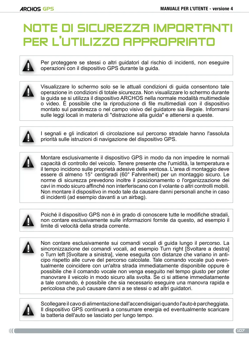 Per proteggere se stessi o altri guidatori dal rischio di incidenti, non eseguire operazioni con il dispositivo GPS durante la guida. Visualizzare lo schermo solo se le attuali condizioni di guida consentono tale operazione in condizioni di totale sicurezza. Non visualizzare lo schermo durante la guida se si utilizza il dispositivo Archos nella normale modalità multimediale o video. È possibile che la riproduzione di file multimediali con il dispositivo montato sul parabrezza o nel campo visivo del guidatore sia illegale. Informarsi sulle leggi locali in materia di "distrazione alla guida" e attenersi a queste. I segnali e gli indicatori di circolazione sul percorso stradale hanno l'assoluta priorità sulle istruzioni di navigazione del dispositivo GPS. Montare esclusivamente il dispositivo GPS in modo da non impedire le normali capacità di controllo del veicolo. Tenere presente che l'umidità, la temperatura e il tempo incidono sulle proprietà adesive della ventosa. L'area di montaggio deve essere di almeno 15° centigradi (60° Fahrenheit) per un montaggio sicuro. Le norme di sicurezza prevedono inoltre il posizionamento o l'organizzazione dei cavi in modo sicuro affinché non interferiscano con il volante o altri controlli mobili. Non montare il dispositivo in modo tale da causare danni personali anche in caso di incidenti (ad esempio davanti a un airbag). Poiché il dispositivo GPS non è in grado di conoscere tutte le modifiche stradali, non contare esclusivamente sulle informazioni fornite da questo, ad esempio il limite di velocità della strada corrente. Non contare esclusivamente sui comandi vocali di guida lungo il percorso. La sincronizzazione dei comandi vocali, ad esempio Turn right [Svoltare a destra] o Turn left [Svoltare a sinistra], viene eseguita con distanze che variano in anticipo rispetto alle curve del percorso calcolate. Tale comando vocale può eventualmente coincidere con un'altra strada immediatamente disponibile oppure è possibile che il comando vocale non venga eseguito nel tempo giusto per poter manovrare il veicolo in modo sicuro alla svolta. Se ci si attiene immediatamente a tale comando, è possibile che sia necessario eseguire una manovra rapida e pericolosa che può causare danni a se stessi o ad altri guidatori. Scollegare il cavo di alimentazione dall'accendisigari quando l'auto è parcheggiata. Il dispositivo GPS continuerà a consumare energia ed eventualmente scaricare la batteria dell'auto se lasciato per lungo tempo.