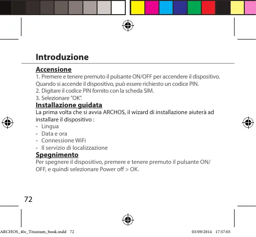 Installazione guidata La prima volta che si awvia ARCHOS, i wizard diinstallazione aiuterà ad installare il dispositivo - Lingua + Datae or = Connessione Wifi - Ilservizio di localizzazione Spegnimento Per spegnere il dispositivo, premere « tenere premuto il pulsante ON/ OFF, e quindi selezionare Power off > OK.