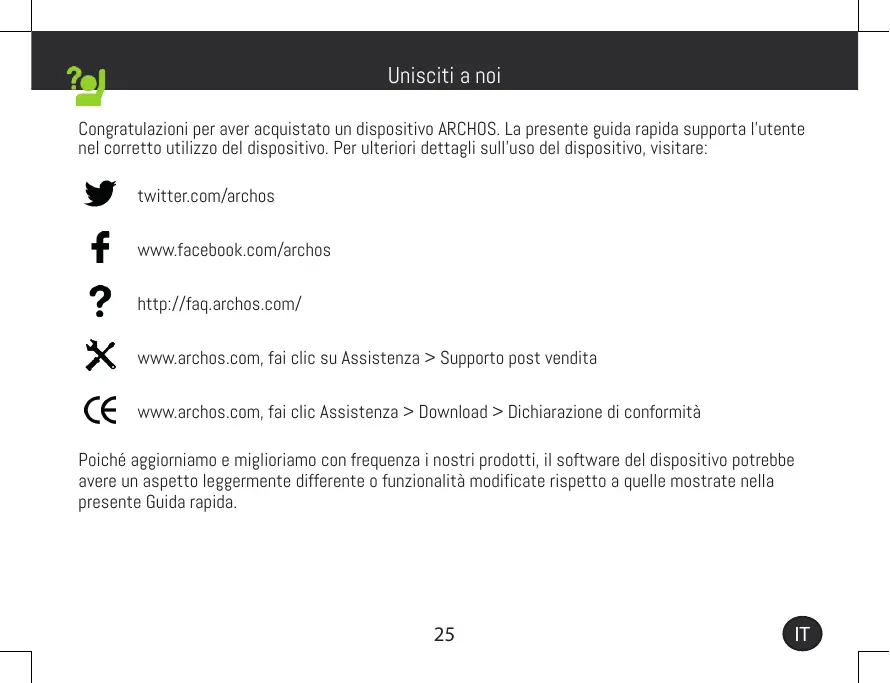 Unisciti a noi Congratulazioni per aver acquistato un dispositivo ARCHOS. La presente guida rapida supporta l'utente nel corretto utilizzo del dispositivo. Per ulteriori dettagli sull'uso del dispositivo, visitare: twitter.com/archos www.facebook.com/archos http://faq.archos.com/ www.archos.com, fai clic su Assistenza > Supporto post vendita www.archos.com, fai clic Assistenza > Download > Dichiarazione di conformità Poiché aggiorniamo e miglioriamo con frequenza i nostri prodotti, il software del dispositivo potrebbe avere un aspetto leggermente differente o funzionalità modificate rispetto a quelle mostrate nella presente Guida rapida.