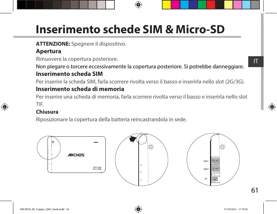 ARCHOS_90_Copper_QSG_book.indd 60 17/10/2014 17:35:01 Inserimento schede SIM & Micro-SD ATTENZIONE: Spegnere il dispositivo. Apertura Rimuovere la copertura posteriore. Non piegare o torcere eccessivamente la copertura posteriore. Si potrebbe danneggiare.