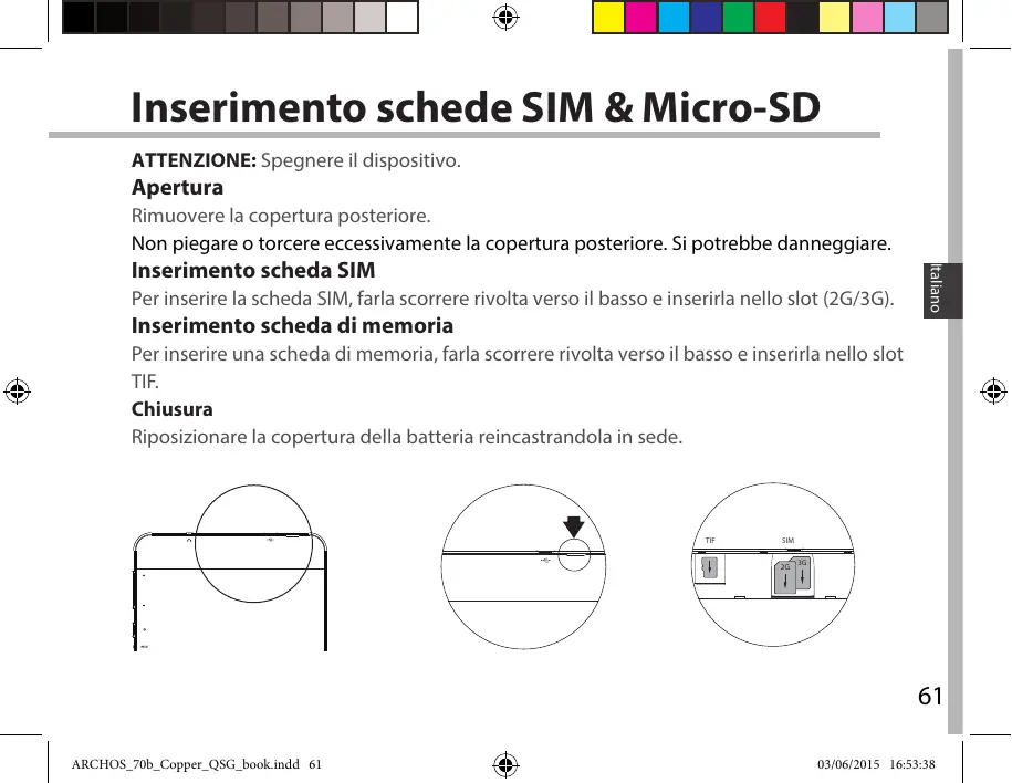 ARCHOS_70b_Copper_QSG_book.indd 60 03/06/2015 16:53:38 Inserimento schede SIM & Micro-SD ATTENZIONE: Spegnere il dispositivo. Apertura Rimuovere la copertura posteriore. Non piegare o torcere eccessivamente la copertura posteriore. Si potrebbe danneggiare. Per inserire la scheda SIM, farla scorrere rivolta verso il basso e inserirla nello slot (2G/3G). Inserimento scheda di memoria Italiano Inserimento scheda SIM Per inserire una scheda di memoria, farla scorrere rivolta verso il basso e inserirla nello slot TIF. Chiusura Riposizionare la copertura della batteria reincastrandola in sede. TIF TIF SIM