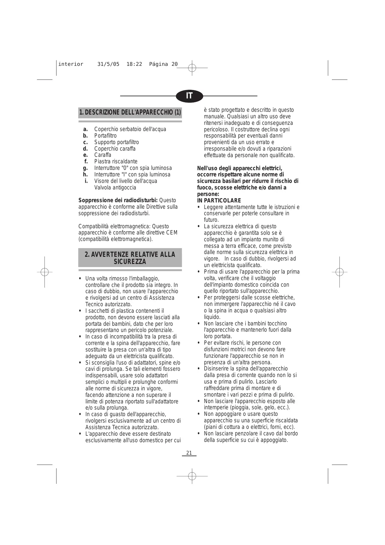 - Se l'apparecchio non è stato disinserito mediante l'interruttore "0" ( ±bg ), la piastra riscaldante rests in funzionamento mantenendo il caffe alla temperatura adequata per il consumo.