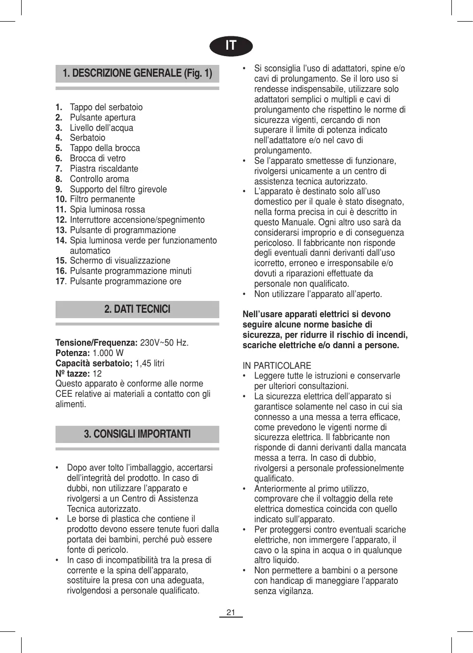- Prima di utilizzare lacaffettiera per la prima volta, familiarizzare con tutti i pezzi. Leggere attendamente tutte le istruzioni.