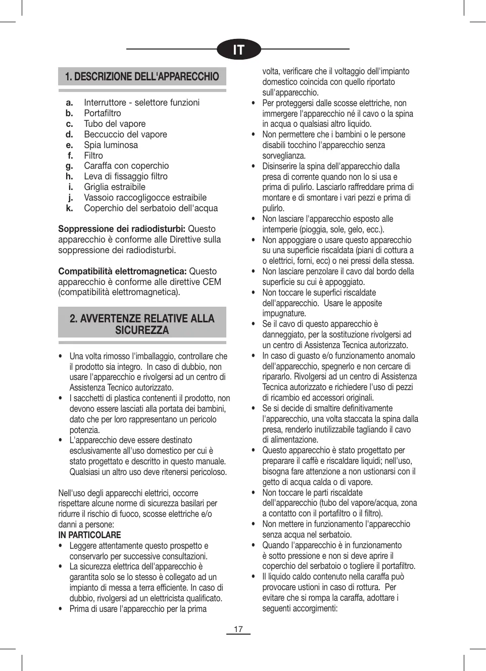 volta, verificare che il voltaggio dell'impianto domestico coincida con quello riportato sull'apparecchio. Per proteggersi dalle scosse elettriche, non immergere l'apparecchio né il cavo o la spina in acqua o qualsiasi altro liquido. Non permettere che i bambini o le persone disabili tocchino l'apparecchio senza sorveglianza. Disinserire la spina dell'apparecchio dalla presa di corrente quando non lo si usa e prima di pulirlo. Lasciarlo raffreddare prima di montare e di smontare i vari pezzi e prima di pulirlo. Non lasciare l'apparecchio esposto alle intemperie (pioggia, sole, gelo, ecc.). Non appoggiare o usare questo apparecchio su una superficie riscaldata (piani di cottura a o elettrici, forni, ecc) o nei pressi della stessa. Non lasciare penzolare il cavo dal bordo della superficie su cui è appoggiato. Non toccare le superfici riscaldate dell'apparecchio. Usare le apposite impugnature. Se il cavo di questo apparecchio è danneggiato, per la sostituzione rivolgersi ad un centro di Assistenza Tecnica autorizzato. In caso di guasto e/o funzionamento anomalo dell'apparecchio, spegnerlo e non cercare di ripararlo. Rivolgersi ad un centro di Assistenza Tecnica autorizzato e richiedere l'uso di pezzi di ricambio ed accessori originali. Se si decide di smaltire definitivamente l'apparecchio, una volta staccata la spina dalla presa, renderlo inutilizzabile tagliando il cavo di alimentazione. Questo apparecchio è stato progettato per preparare il caffè e riscaldare liquidi; nell'uso, bisogna fare attenzione a non ustionarsi con il getto di acqua calda o di vapore. Non toccare le parti riscaldate dell'apparecchio (tubo del vapore/acqua, zona a contatto con il portafiltro o il filtro). Non mettere in funzionamento l'apparecchio senza acqua nel serbatoio. Quando l'apparecchio è in funzionamento è sotto pressione e non si deve aprire il coperchio del serbatoio o togliere il portafiltro. Il liquido caldo contenuto nella caraffa può provocare ustioni in caso di rottura. Per evitare che si rompa la caraffa, adottare i seguenti accorgimenti: