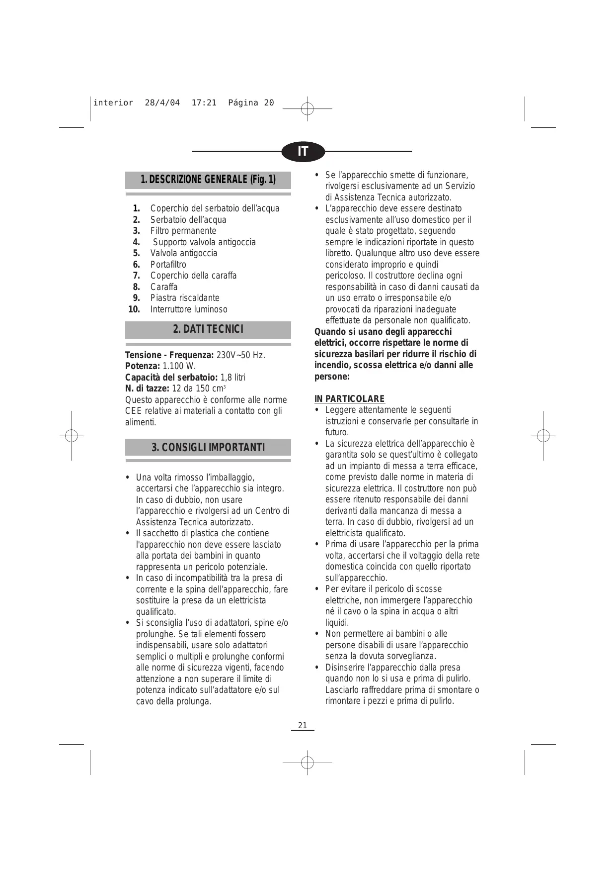 Tensione - Frequenza: 230V~50 Hz. Potenza: 1.100 W. Capacità del serbatoio: 1,8 litri N. di tazze: 12 da 150 cm3 Questo apparecchio è conforme alle norme CEE relative ai materiali a contatto con gli alimenti. IN PARTICOLARE