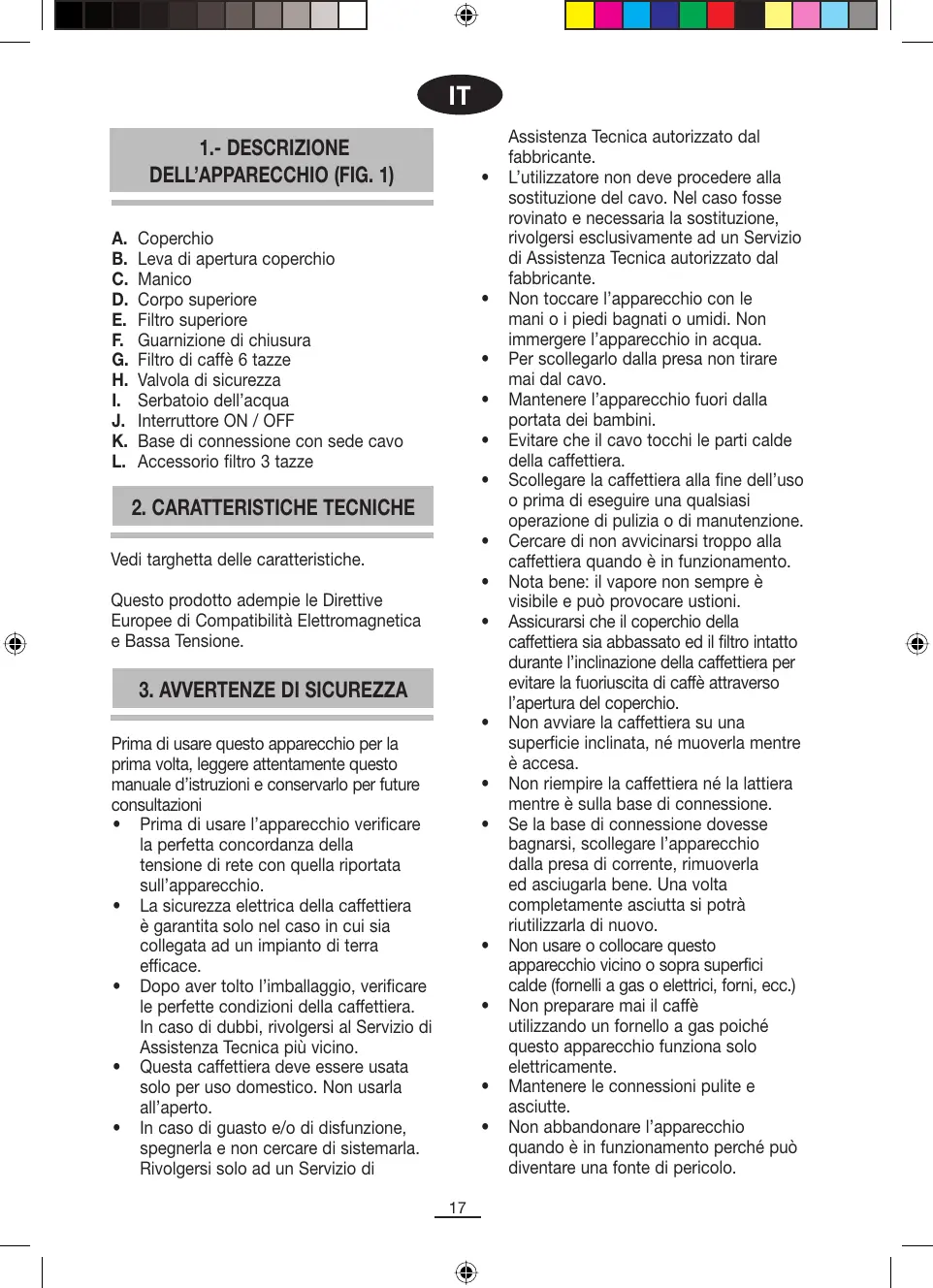 Coperchio Leva di apertura coperchio Manico Corpo superiore Filtro superiore Guarnizione di chiusura Filtro di caffè 6 tazze Valvola di sicurezza Serbatoio dell’acqua Interruttore ON / OFF Base di connessione con sede cavo Accessorio filtro 3 tazze